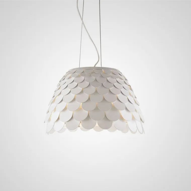 Дизайнерская люстра на струнном подвесе с купольным абажуром из белых металлических дисков