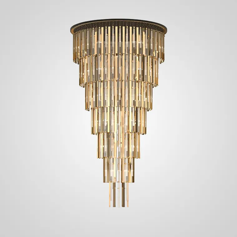 Серия каскадных люстр с чередующимися цилиндрическими стеклянными плафонами и трубчатыми подвесками из металла