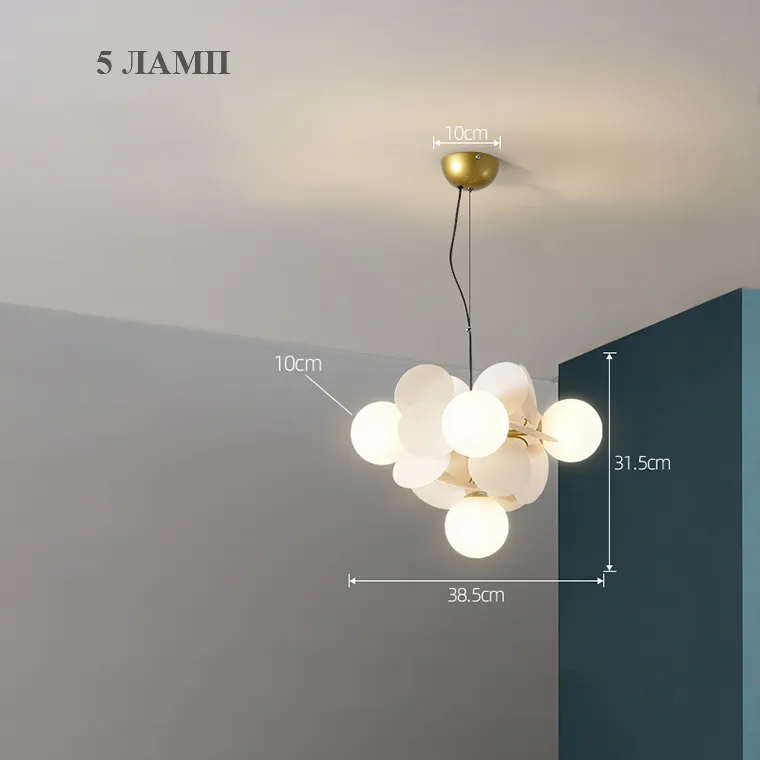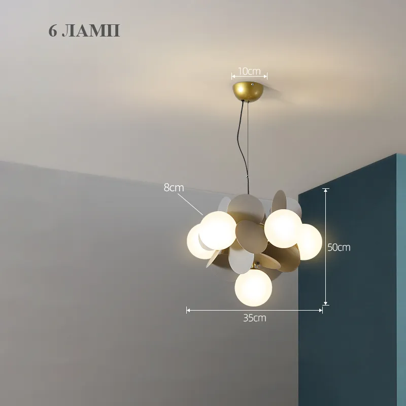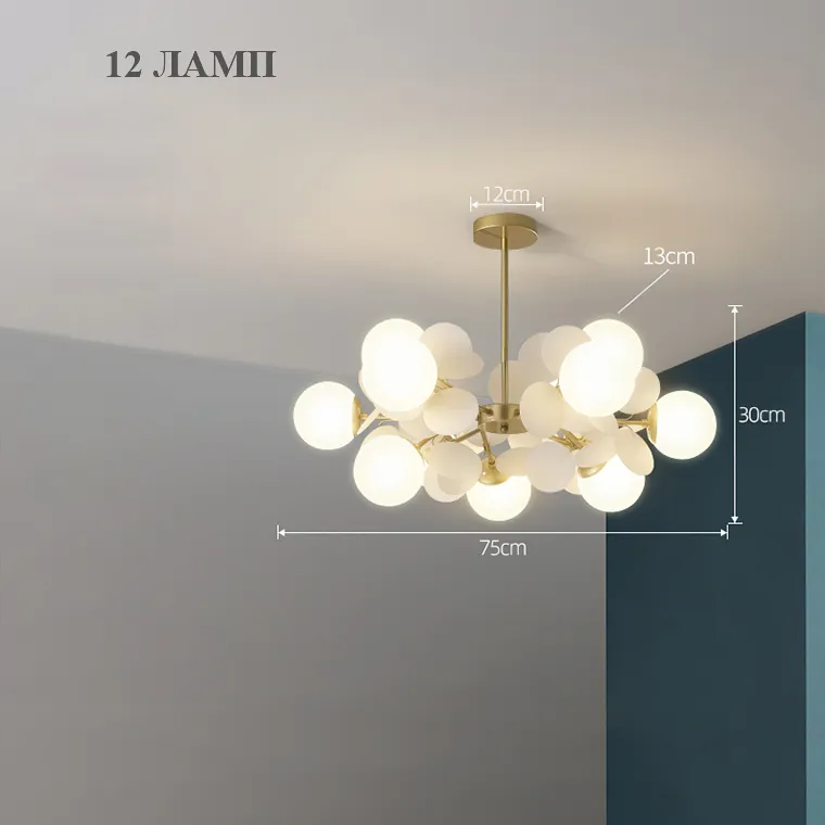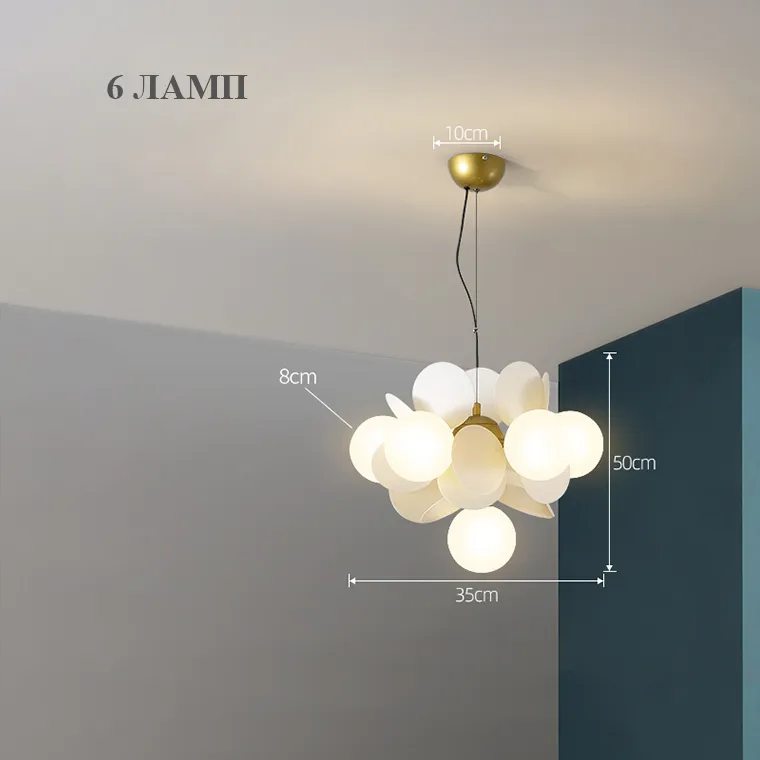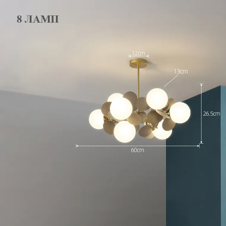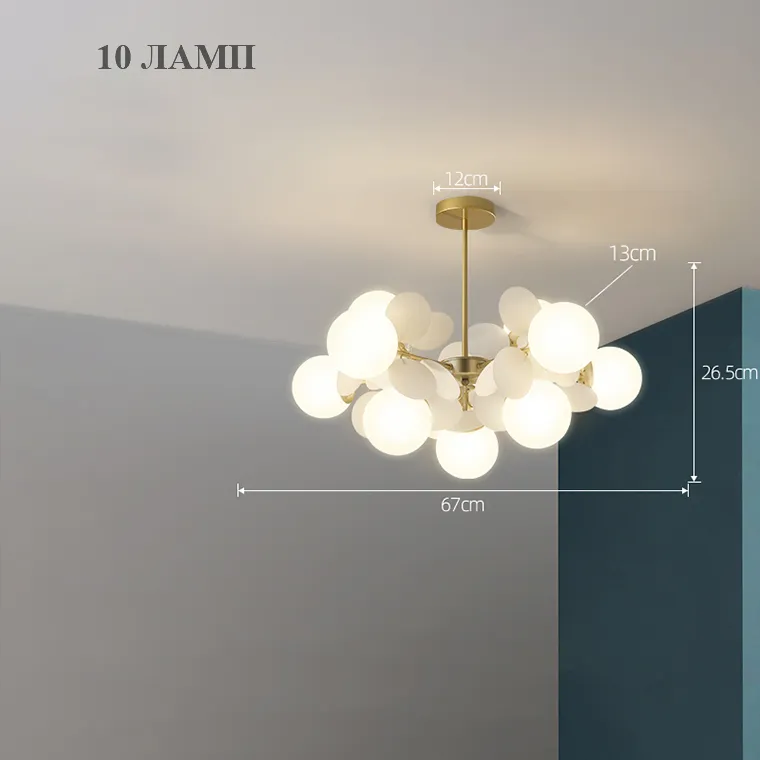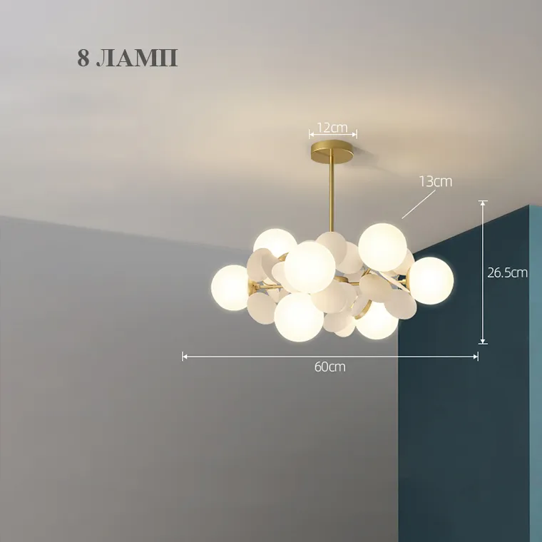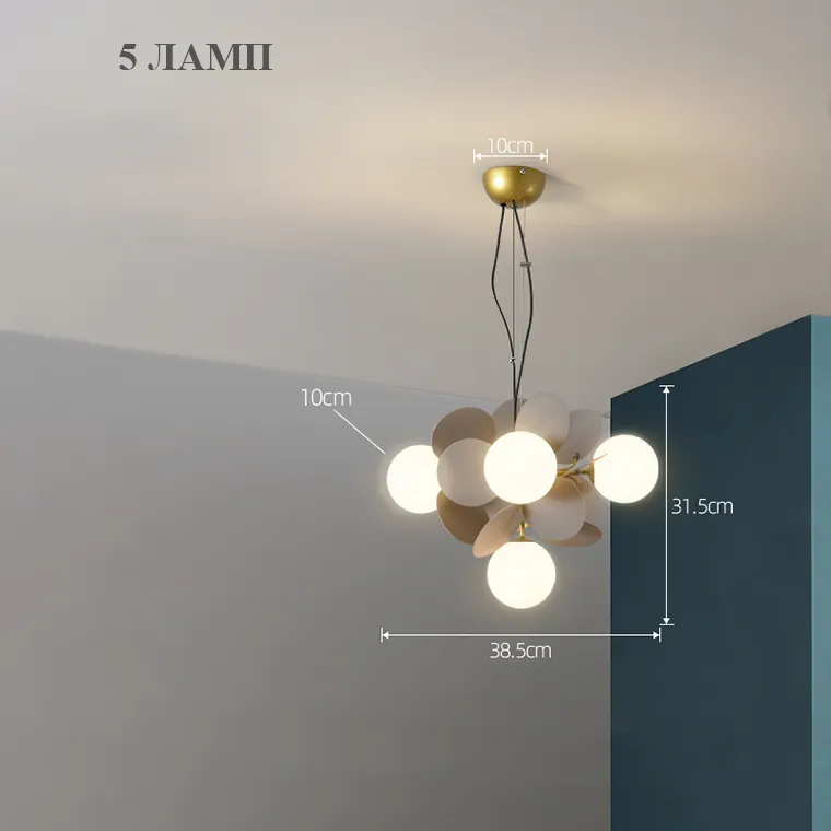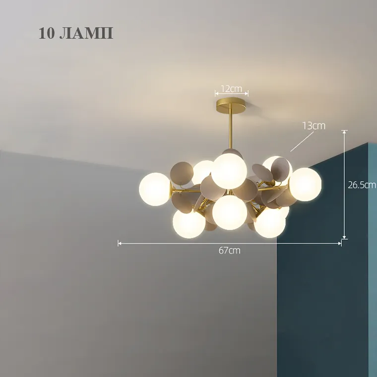Плафоны выполнены в форме шара и имеют матовое белое покрытие, что придаёт им особую элегантность. Материал изготовления — металл и стекло, а тип цоколя — E27 и G9, что гарантирует надёжность и долговечность светильника.
