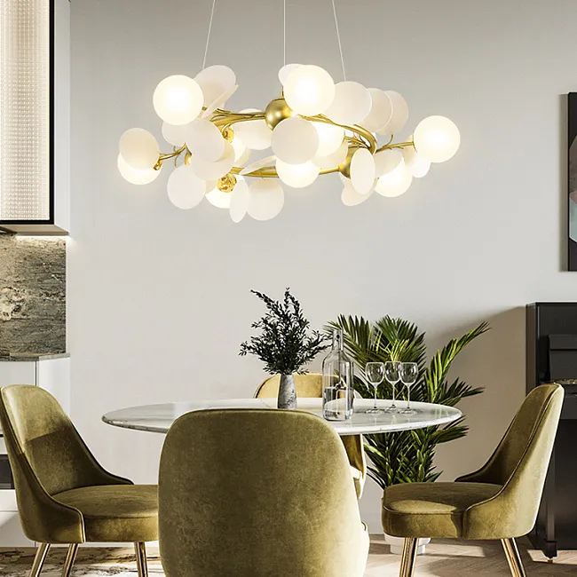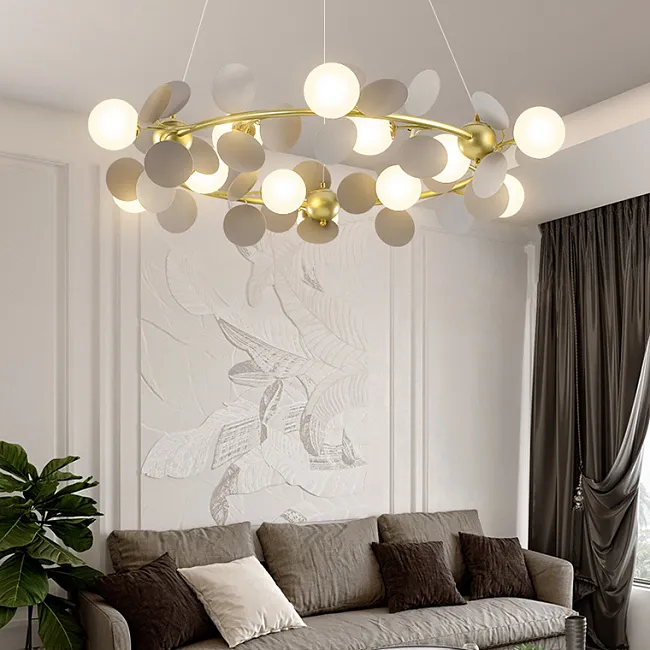 Плафоны выполнены в форме шара и имеют матовое белое покрытие, что придаёт им особую элегантность. Материал изготовления — металл и стекло, а тип цоколя — E27 и G9, что гарантирует надёжность и долговечность светильника.