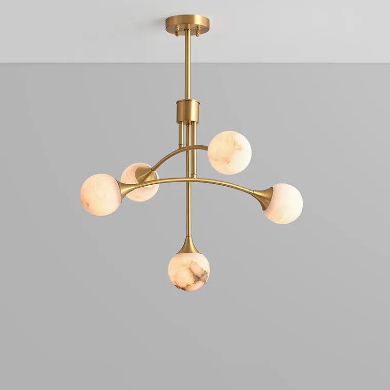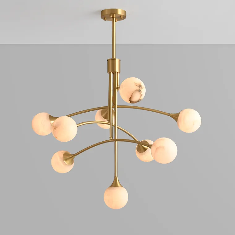 Серия дизайнерских люстр с шарообразными плафонами из натурального мрамора на изогнутых рейках