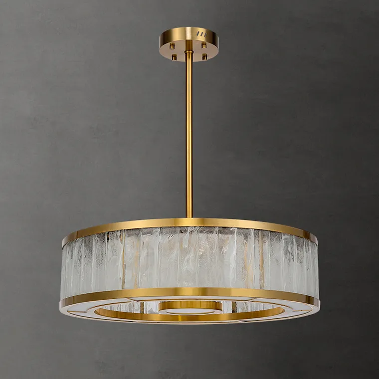 Серия люстр на кольцевом каркасе c внутренним LED-свечением по контуру цилиндрического плафона из стеклянных пластин с эффектом «Белый дым»