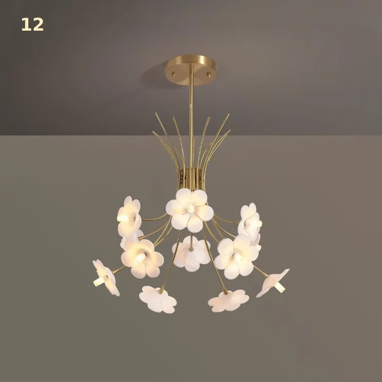 Серия дизайнерских люстр в виде пучка изогнутых рожек с белыми плафонами в форме цветов