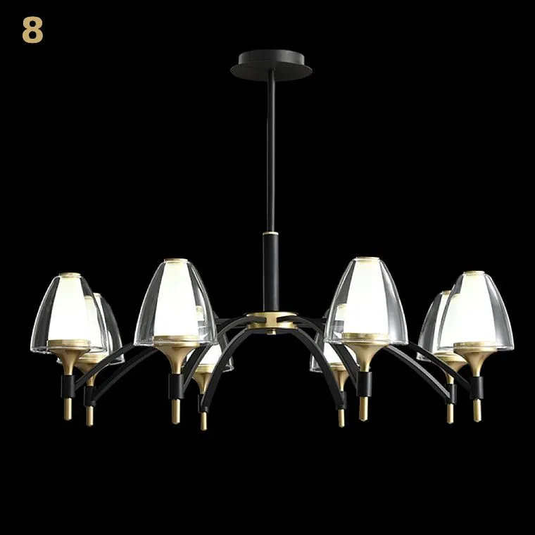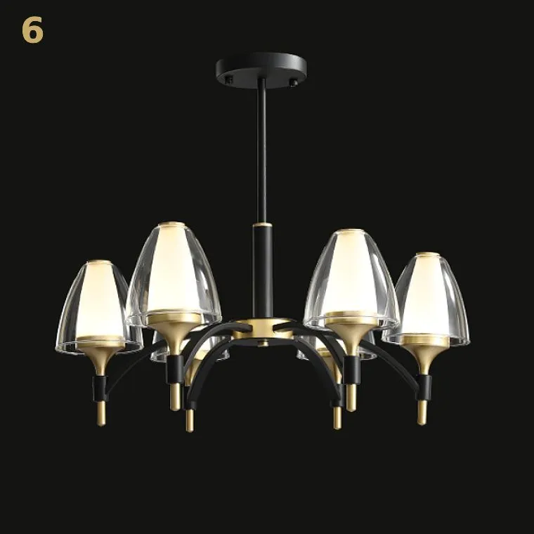 Каждый плафон изготовлен из прозрачного стекла в форме конуса, с дополнительным белым матовым плафоном внутри. Уникальное сочетание латунного и черного цветов в каркасе создает контраст и придает люстре особую изящность.