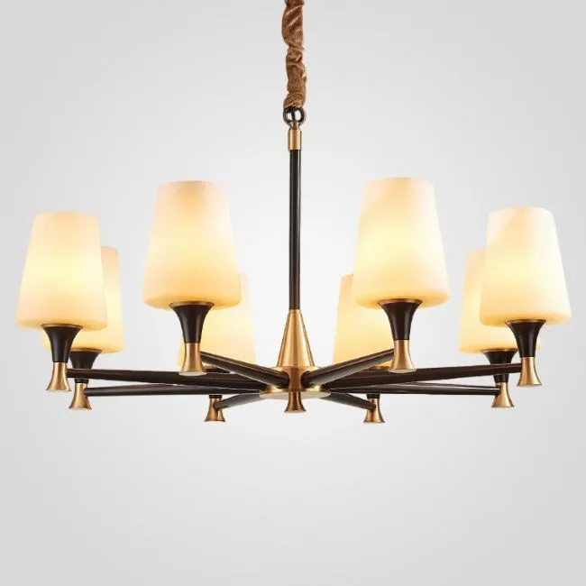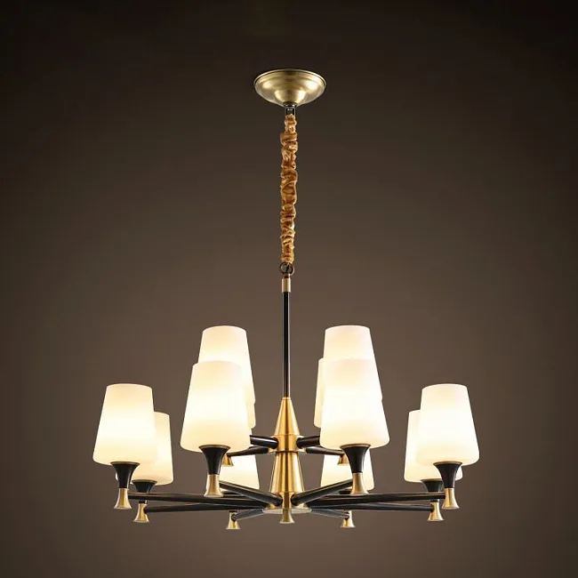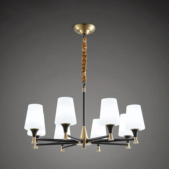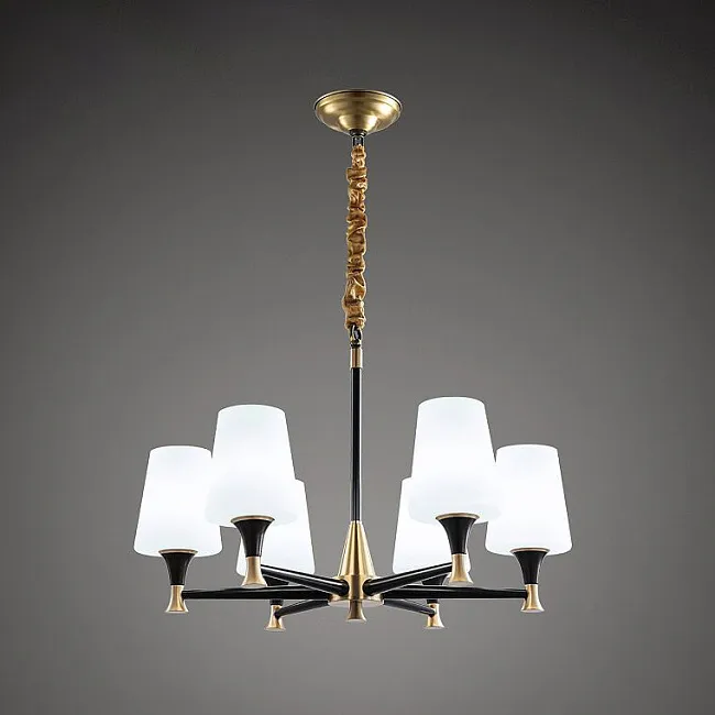 Каждый плафон изготовлен из прозрачного стекла в форме конуса, с дополнительным белым матовым плафоном внутри. Уникальное сочетание латунного и черного цветов в каркасе создает контраст и придает люстре особую изящность.