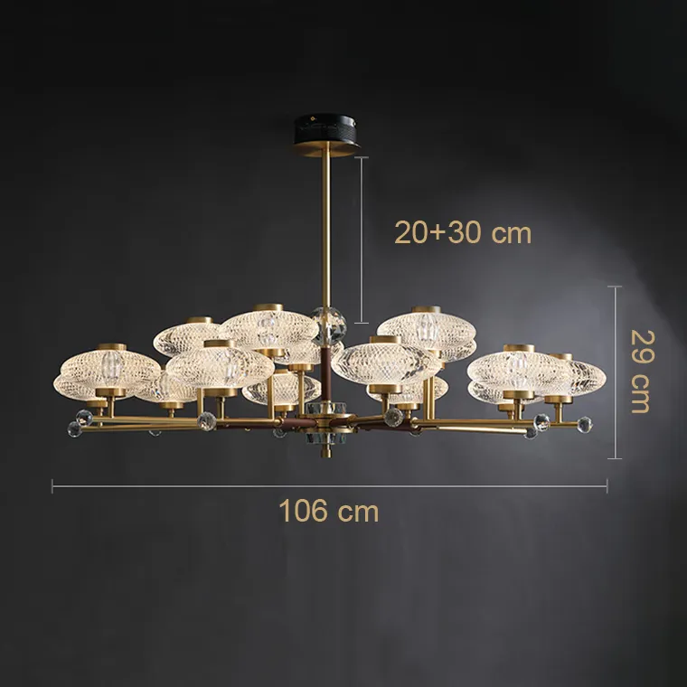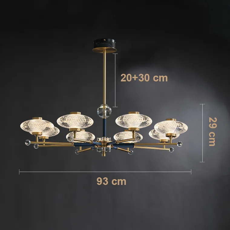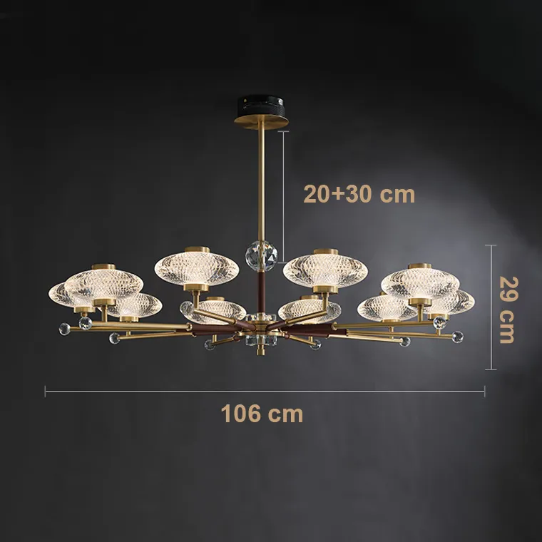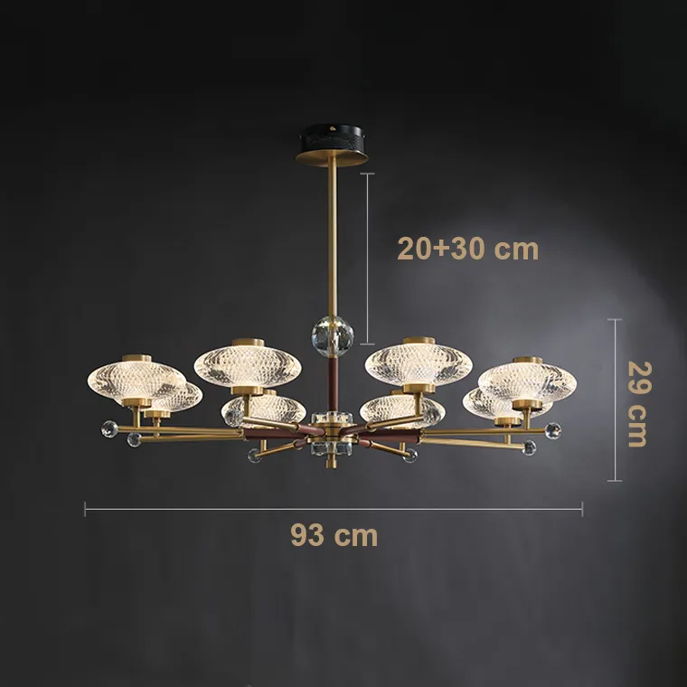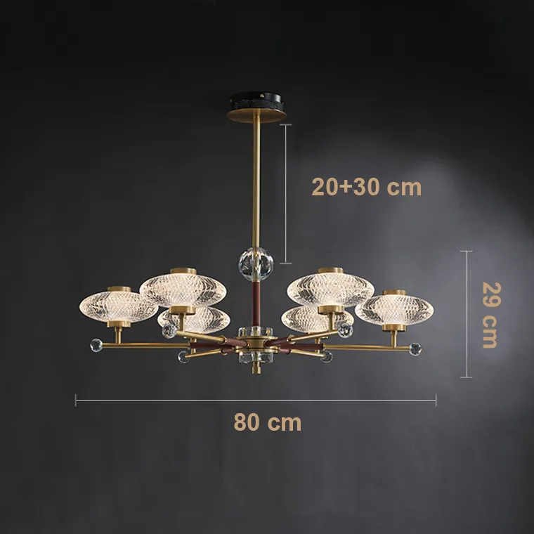 Высота подвеса составляет 20 и 30 см, что позволяет регулировать высоту освещения в зависимости от ваших потребностей. Корпус люстры изготовлен из высококачественной латуни H65, а плафоны - из прочного хрусталя и кожи, что гарантирует долговечность и прочность изделия.