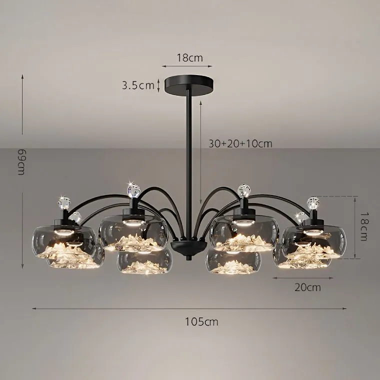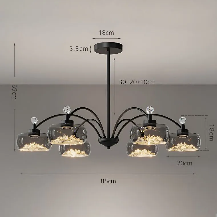 Подвесная люстра с черным металлическим каркасом и изогнутыми рожками, дополненная прозрачными стеклянными плафонами с внутренним узором в виде гор и декоративным хрустальным элементом