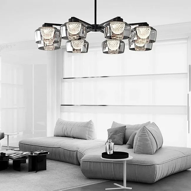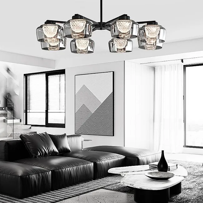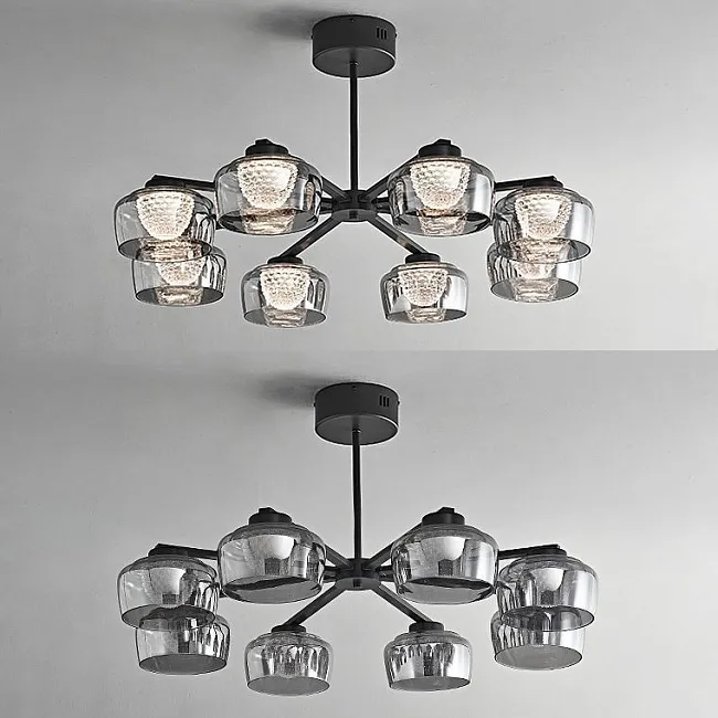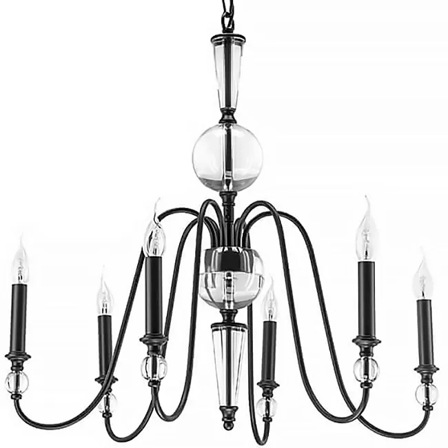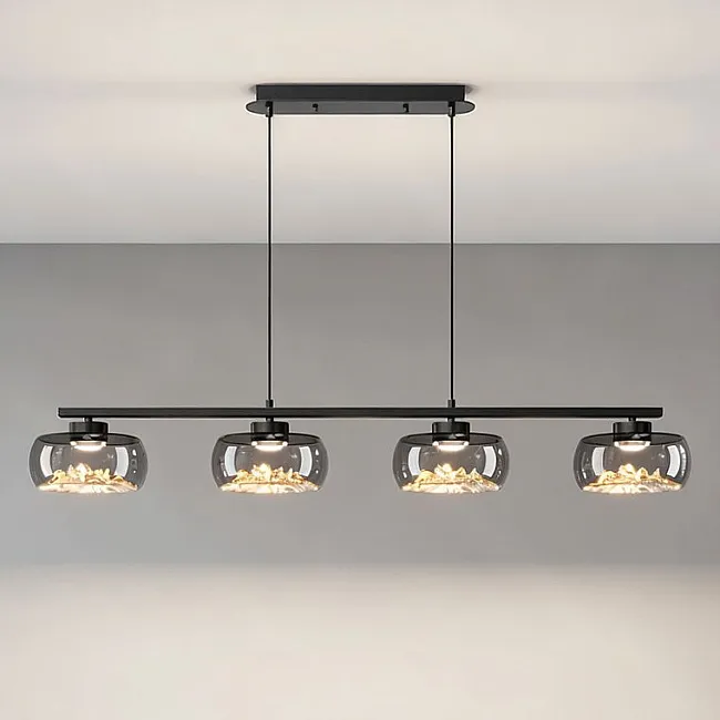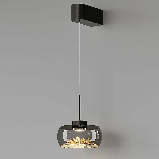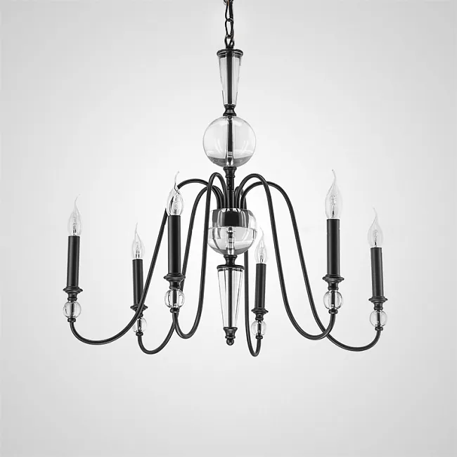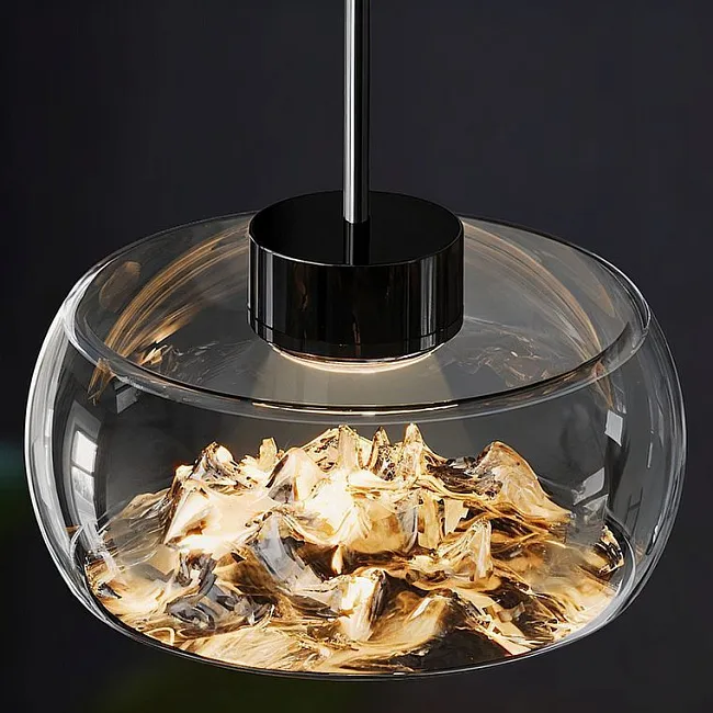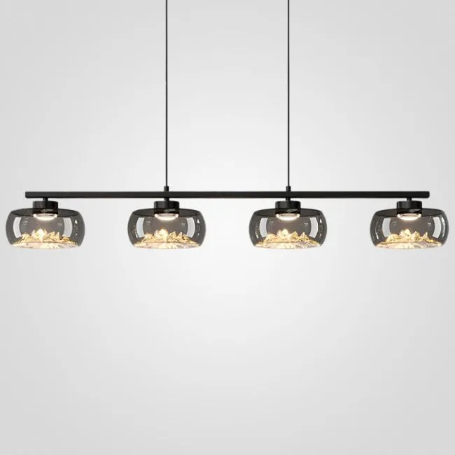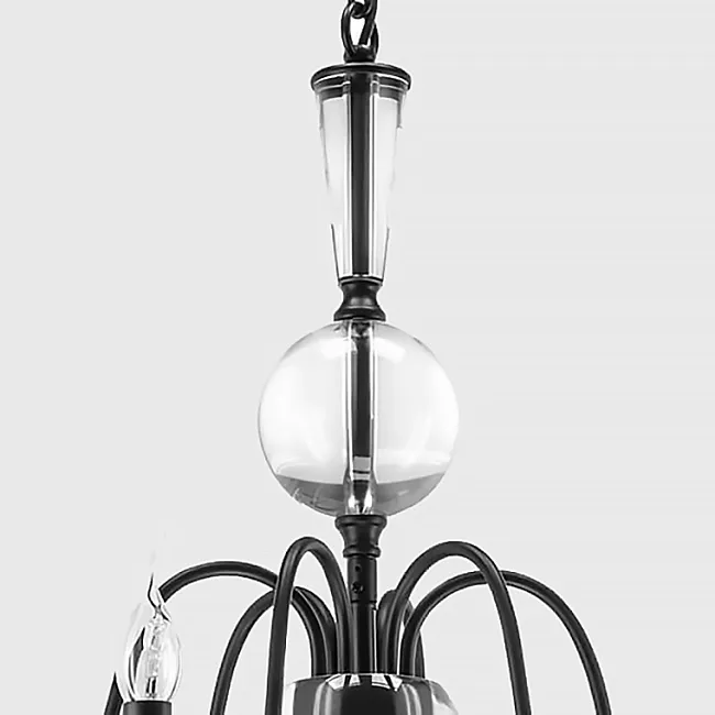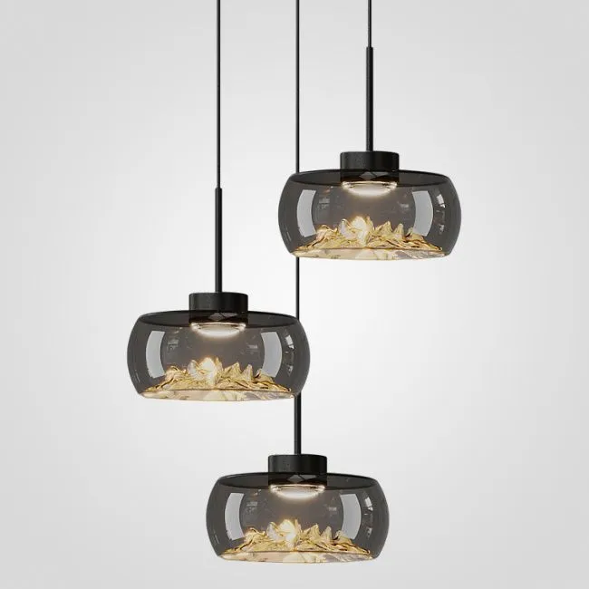 Подвесная люстра с черным металлическим каркасом и изогнутыми рожками, дополненная прозрачными стеклянными плафонами с внутренним узором в виде гор и декоративным хрустальным элементом