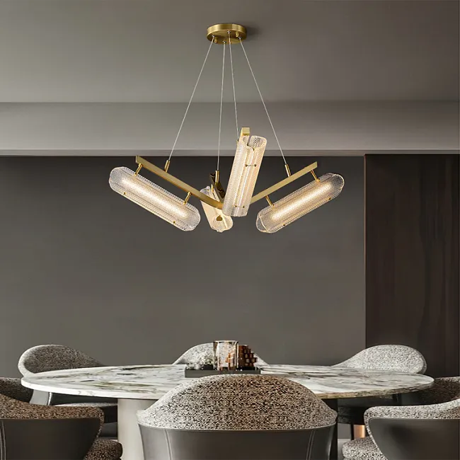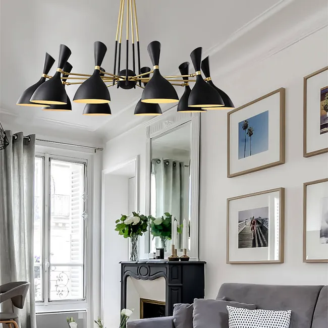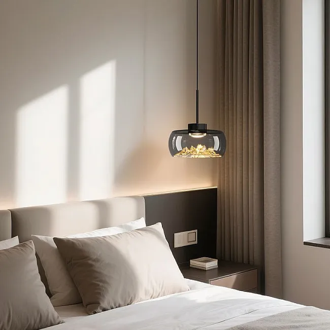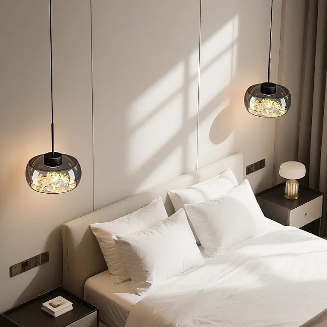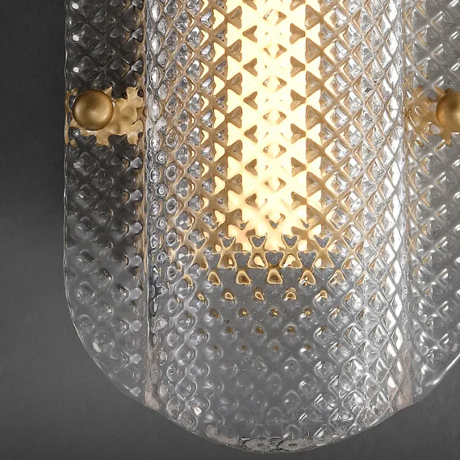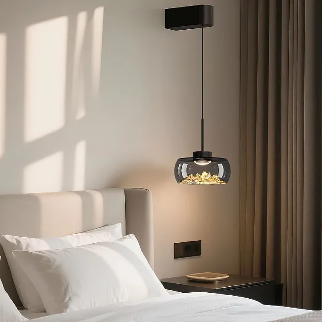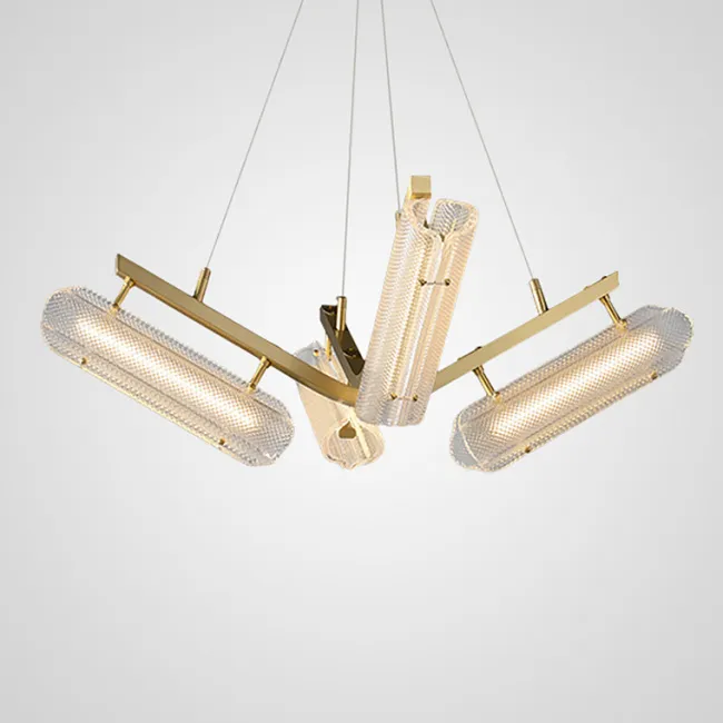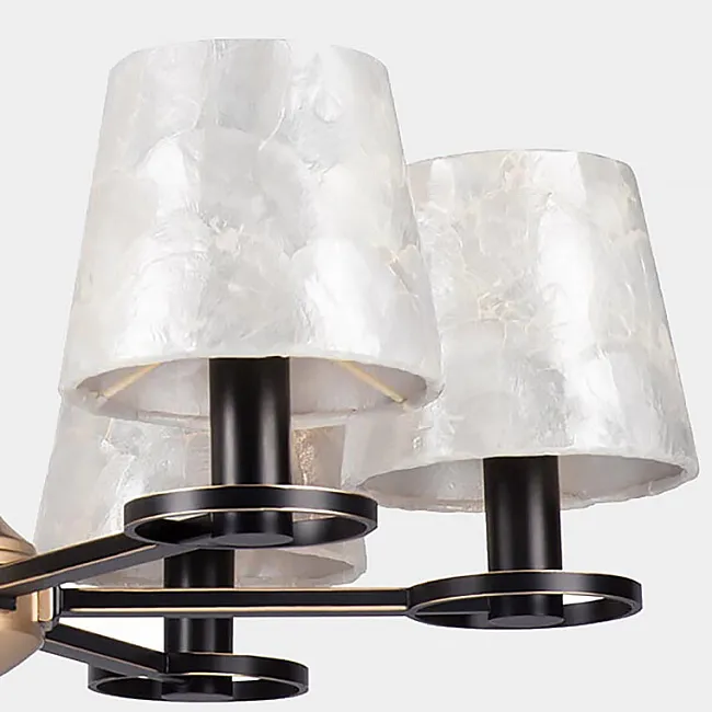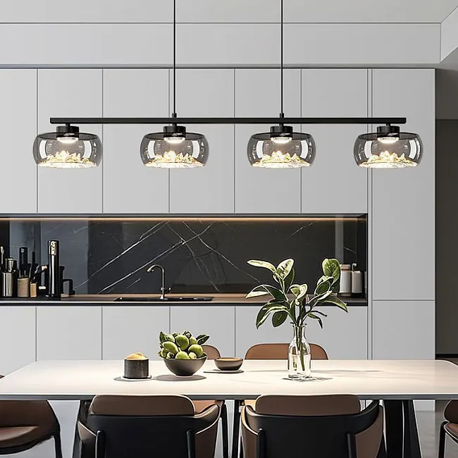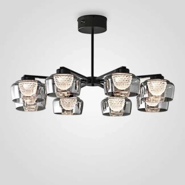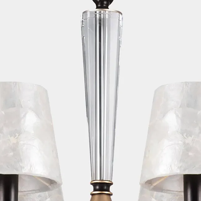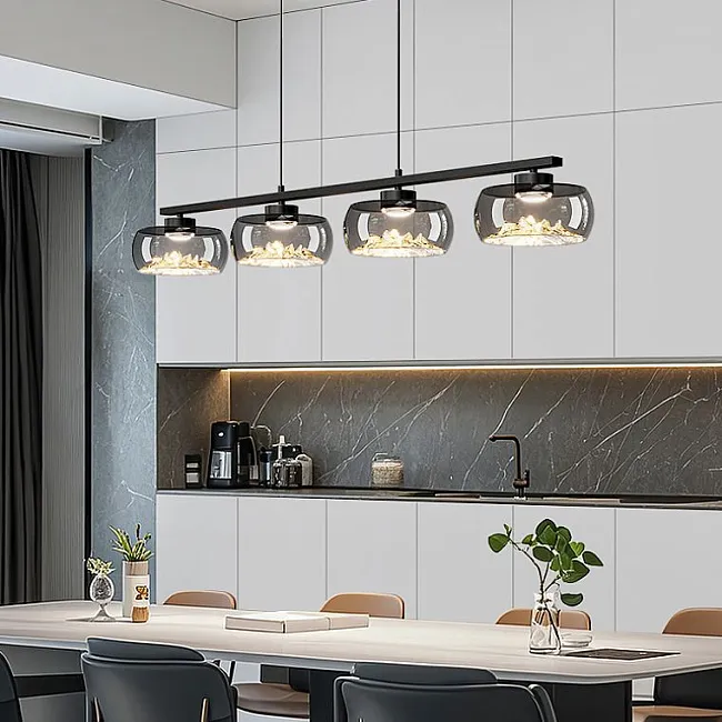 Подвесная люстра с черным металлическим каркасом и изогнутыми рожками, дополненная прозрачными стеклянными плафонами с внутренним узором в виде гор и декоративным хрустальным элементом