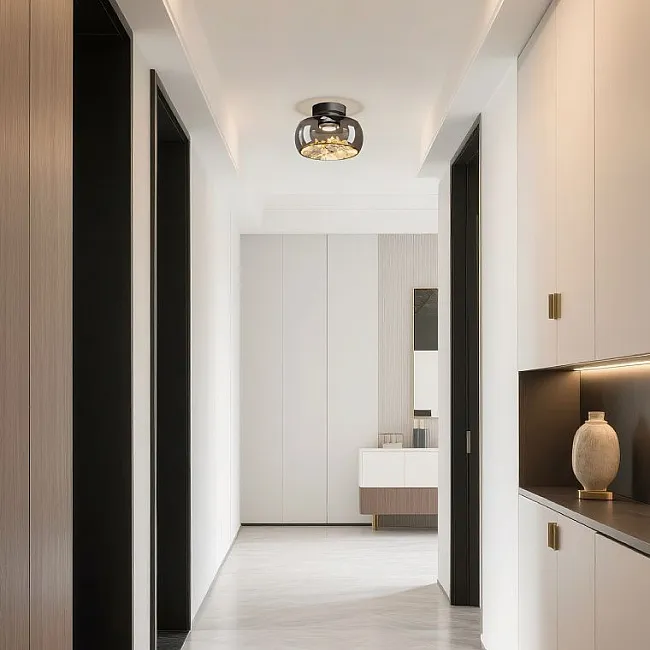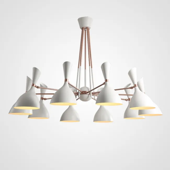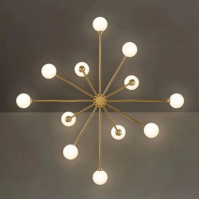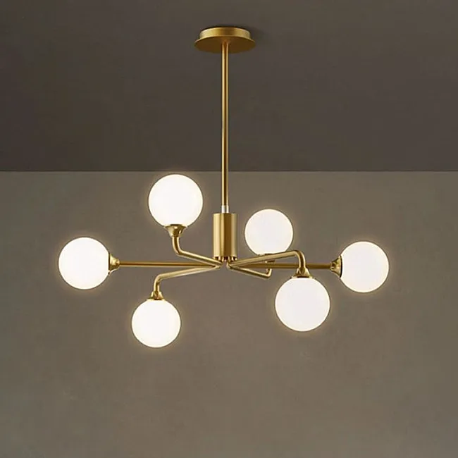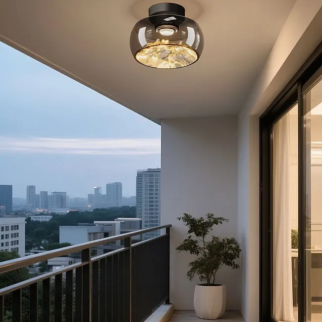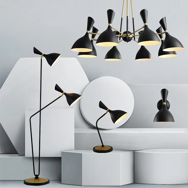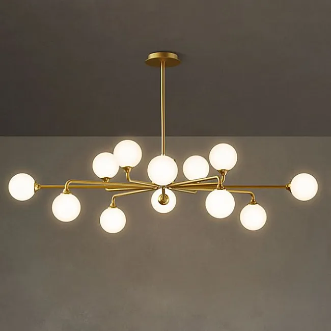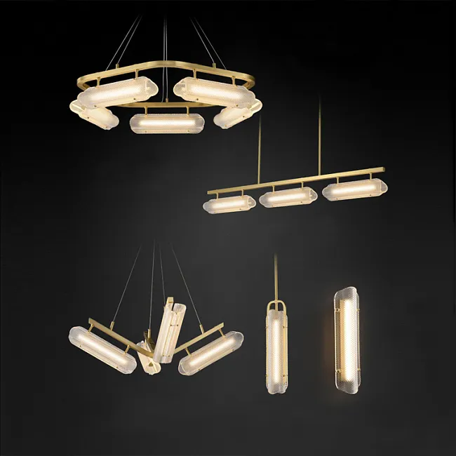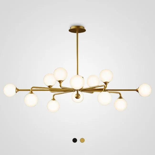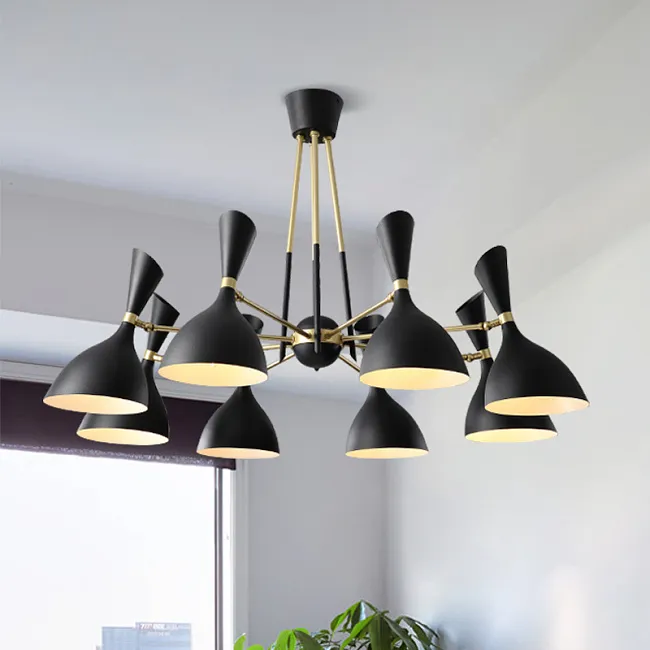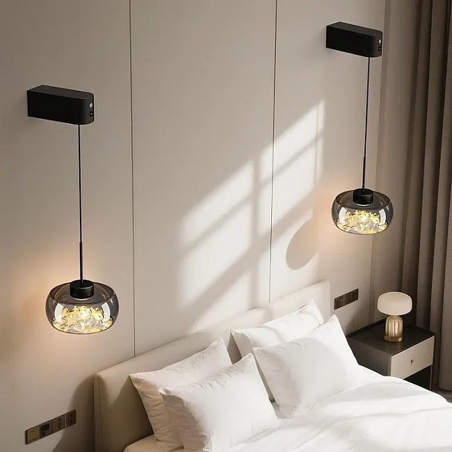 Подвесная люстра с черным металлическим каркасом и изогнутыми рожками, дополненная прозрачными стеклянными плафонами с внутренним узором в виде гор и декоративным хрустальным элементом