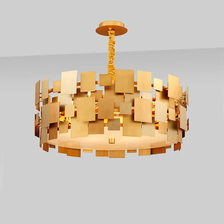 Оригинальная дизайнерская люстра PATTERN в стиле постмодерн с плафоном из подвижных металлических пластин цвета латунь и корицы.