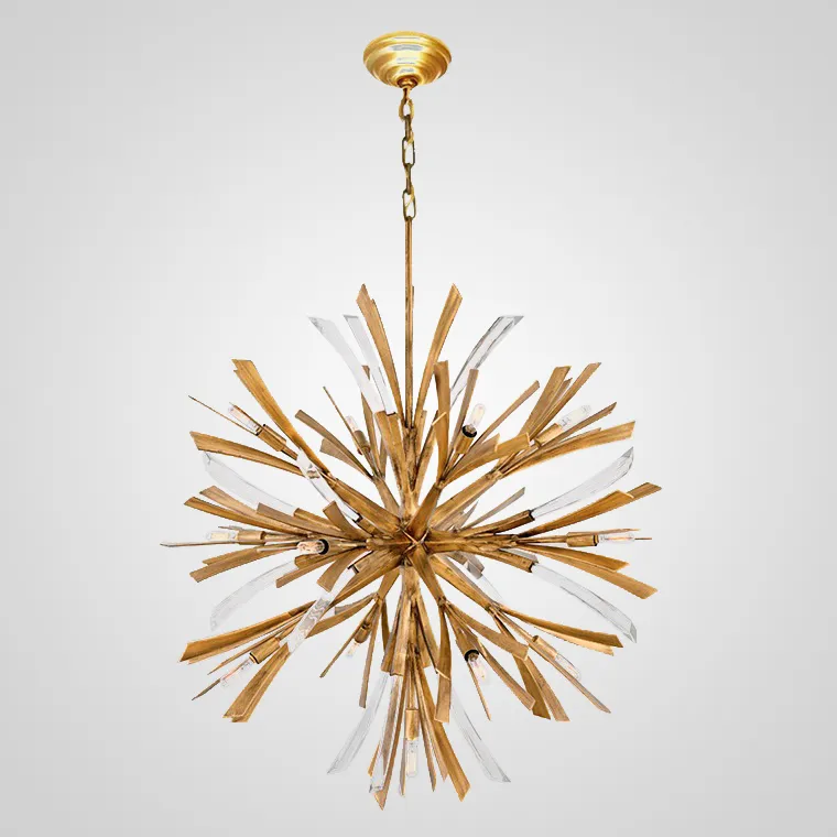 Люстра с комбинированным абажуром из латунных и стеклянных пучков шарообразной формы