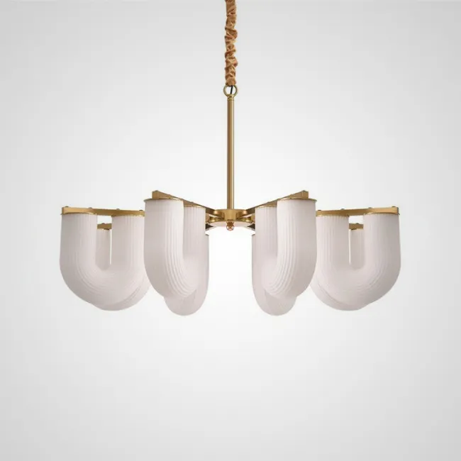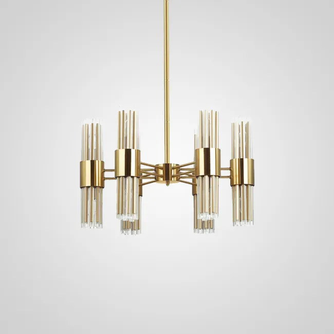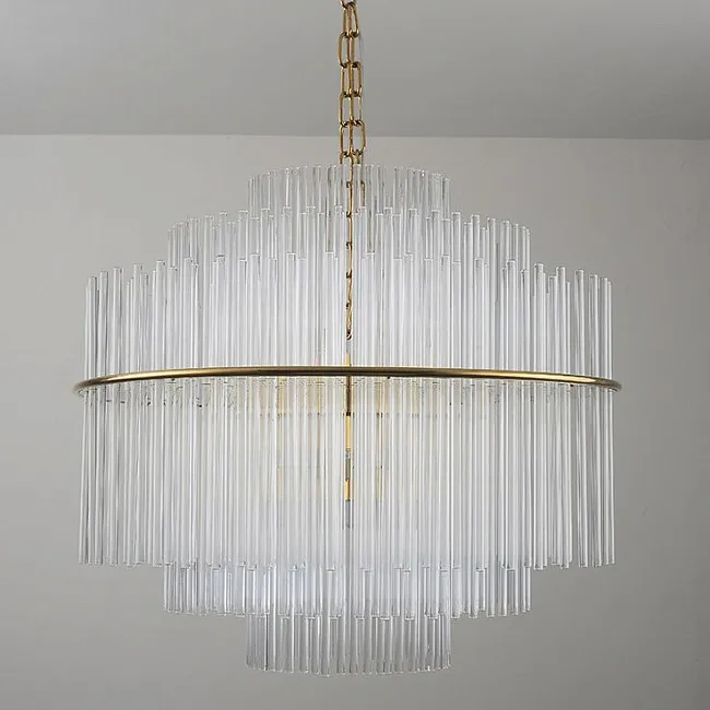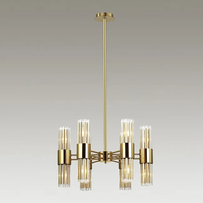 Одной из главных особенностей этой люстры является плафон, выполненный из тонких стеклянных трубочек. Они нежно пронизывают внутреннюю часть квадратного каркаса, создавая потрясающий эффект прозрачности и легкости. Латунный каркас придает всей конструкции ощущение прочности и элегантности.