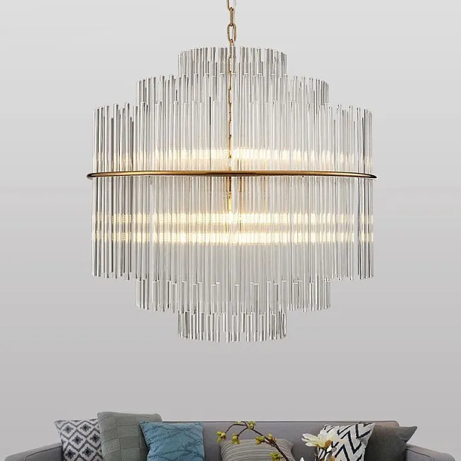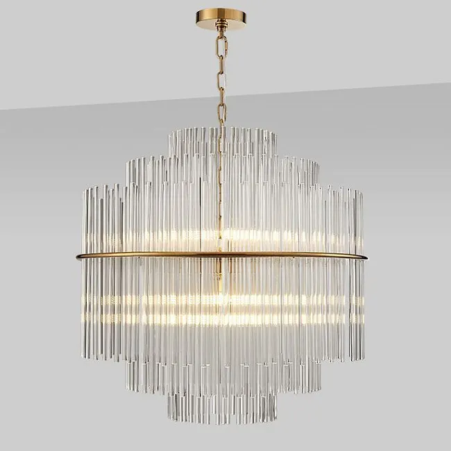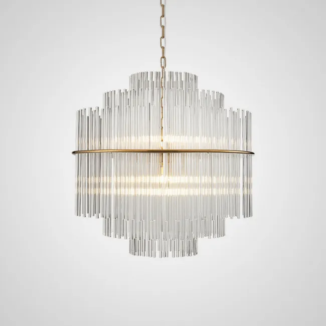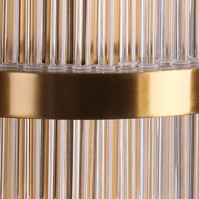 Плафон состоит из двух слоев. Внешний слой выполнен из прозрачного плоского стекла, оформленного в виде канта. Это придает люстре оригинальность и стильность. Внутренний слой состоит из множества прозрачных стеклянных трубочек, которые создают эффект игры света и тени, делая освещение более мягким и приятным.