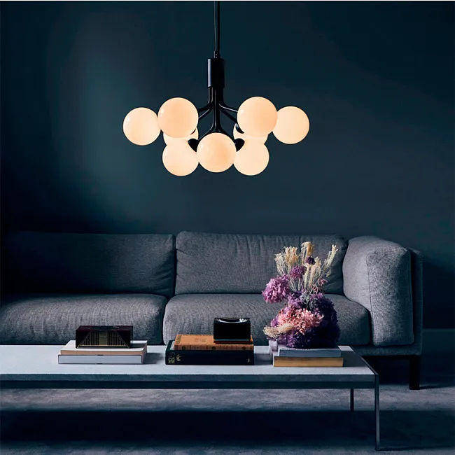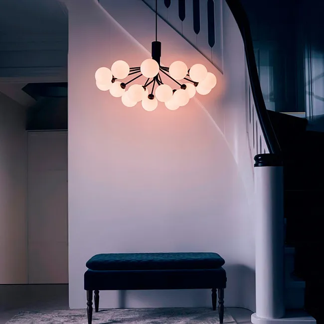 Люстра крутейшая, напоминает мне паука с лампочками в лапках))) дочке-подростку и мужу-привереде понравилась! Висит в гостиной, она в нашем доме лофтовая, современная. И люстра тут гармоничненько смотрится. Но не грубо, хотя и без плафонов. Лампочки тут классные такие, круглые, крупные, глянцевые. Как будто немного с бежевым перламутровым отливом. Освещение яркое, но не слепящее, как иногда бывает.