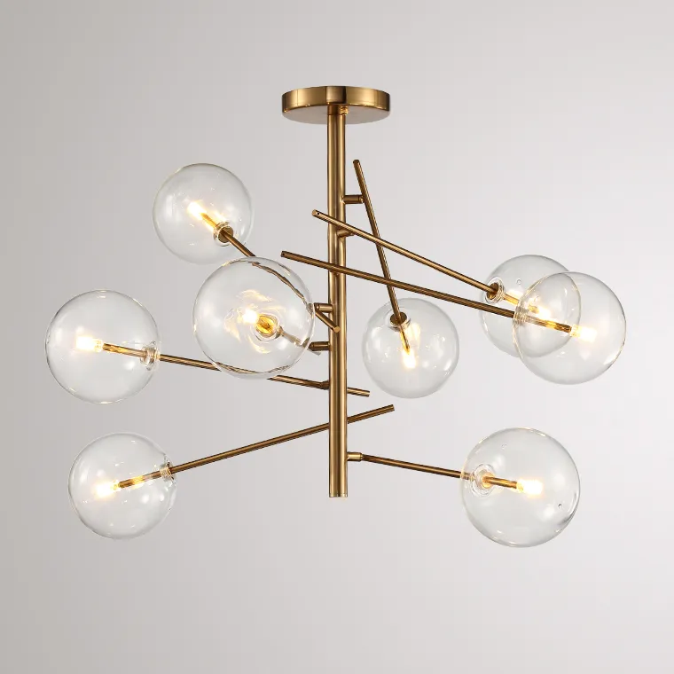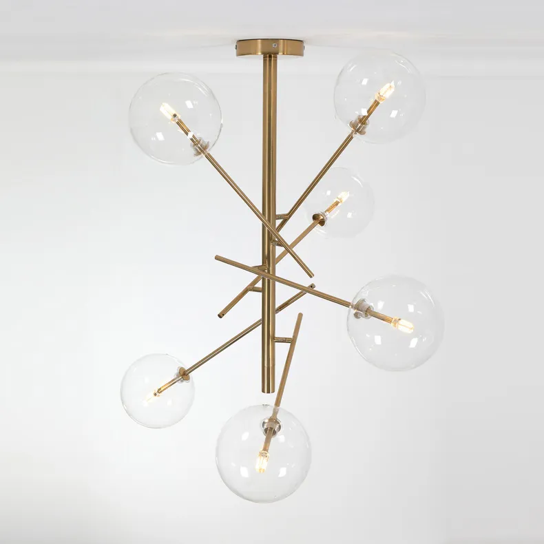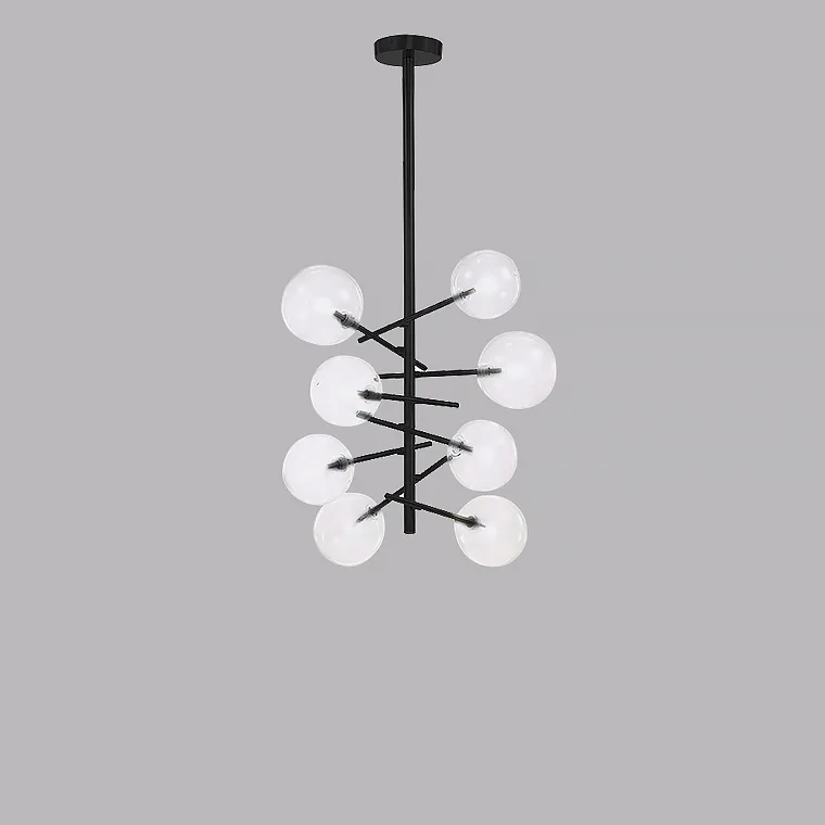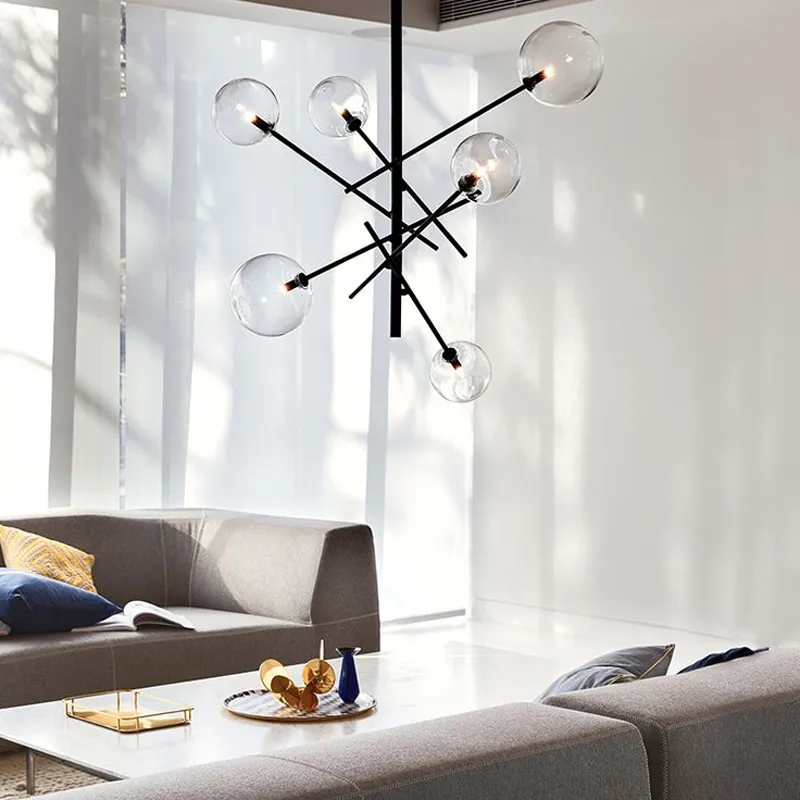 Дизайнерская люстра STOOLS с регулируемыми штангами и стеклянными прозрачными круглыми плафонами – это тренд настоящего времени. Такая люстра создана для таких стилей как минималиизм, хай-тек, современный. Она универсальна настолько, что хорошо будет смотреться как локальный источник света (над столом), так и основной (в центре гостиной). Прозрачные плафоны, располагающиеся на 360 °, не поглощают свет, так что комната будет очень хорошо освещена.
