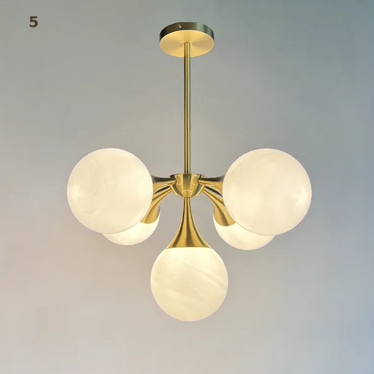 Основное внимание привлекает элегантный дизайн люстры TEOBALD. Латунный каркас люстры комплиментирует белому цвету плафонов, создавая гармоничное и утонченное сочетание.