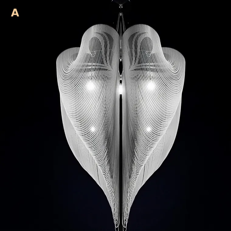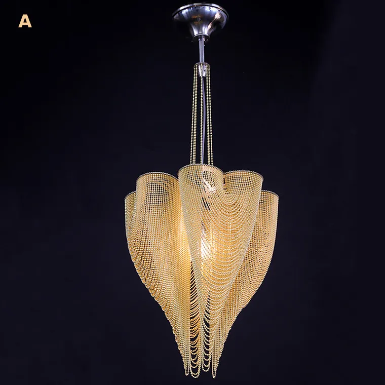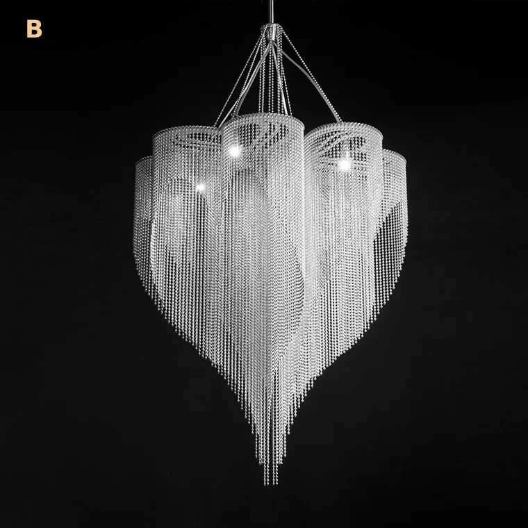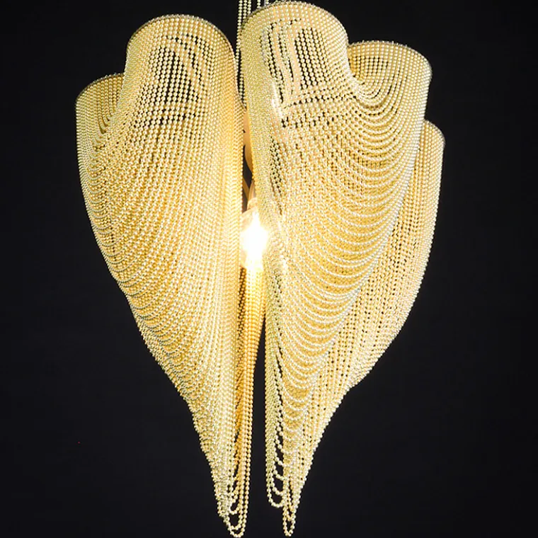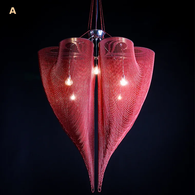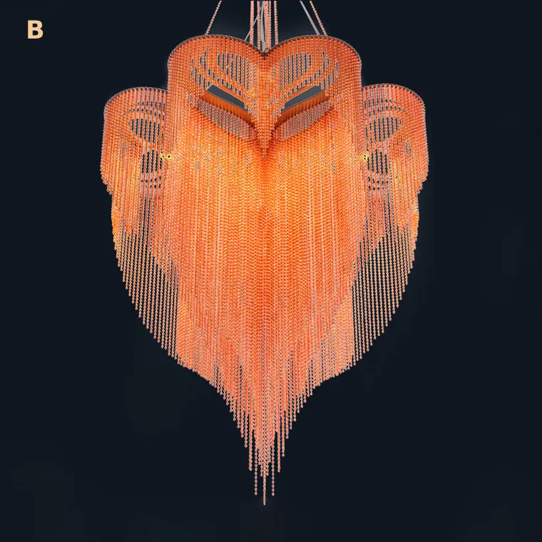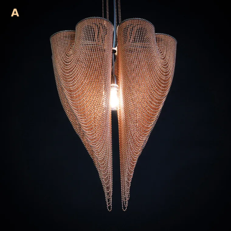 Серия подвесных люстр в виде четырехлистного клевера и сердца с абажуром из металлической цепочки с бусинами