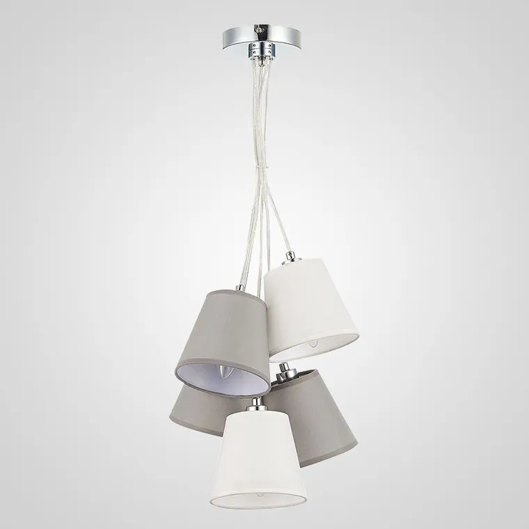 Подвесная люстра в виде грозди конусовидных текстильных плафонов расположенных ярусами