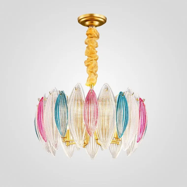 Представьте себе подвесную люстру, которая превращает любое помещение в сказочное царство света и цвета. С ее золотым каркасом, обрамляющим искусно выполненные стеклянные плафоны, эта люстра становится настоящим произведением искусства. Стеклянные листовидные пластины разных цветов, словно миниатюрные витражи, играют бликами и создают атмосферу уюта и тепла.