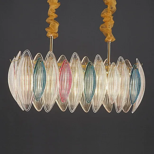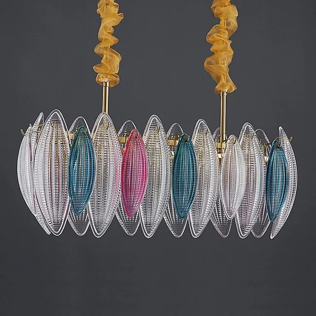 Представьте себе подвесную люстру, которая превращает любое помещение в сказочное царство света и цвета. С ее золотым каркасом, обрамляющим искусно выполненные стеклянные плафоны, эта люстра становится настоящим произведением искусства. Стеклянные листовидные пластины разных цветов, словно миниатюрные витражи, играют бликами и создают атмосферу уюта и тепла.