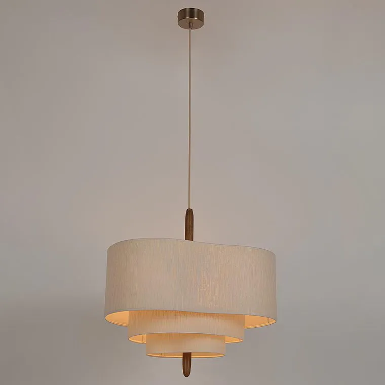 В самом сердце этой люстры – веретенообразная ось из темного дерева. Ее глубокий, насыщенный цвет добавляет нотку драматизма и контраста, подчеркивая воздушность и легкость текстильного абажура.