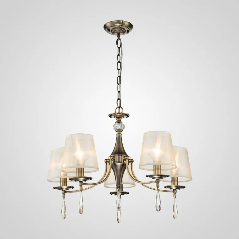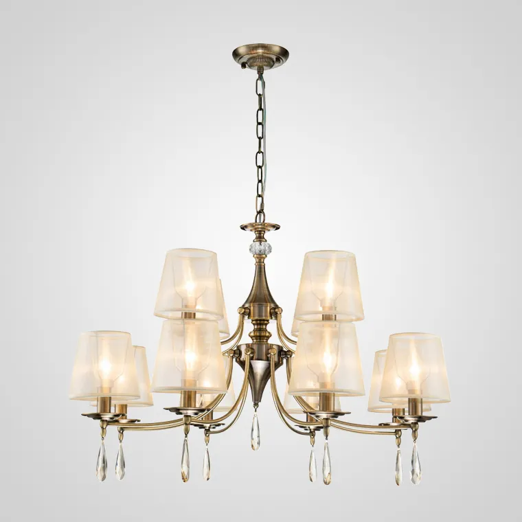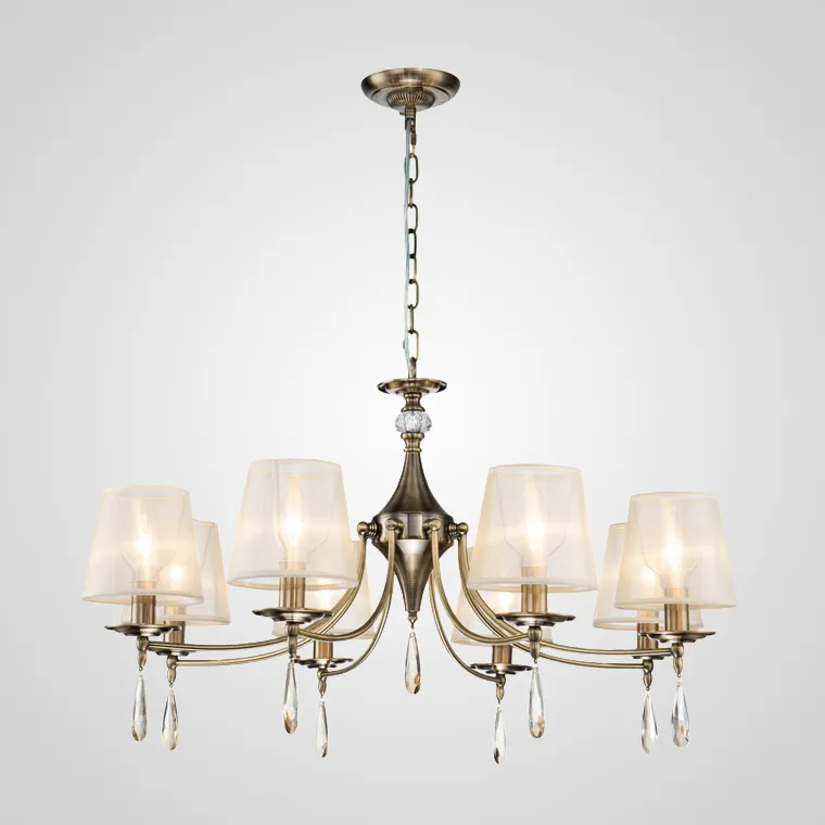 Подвесная люстра с фигурной сердцевиной и коническими плафонами из органзы декорированная хрустальными подвесками
