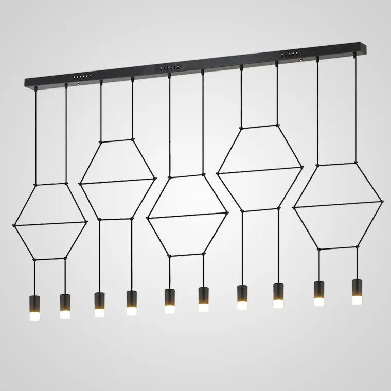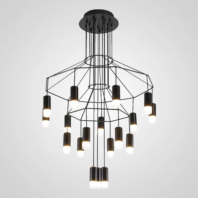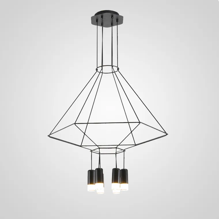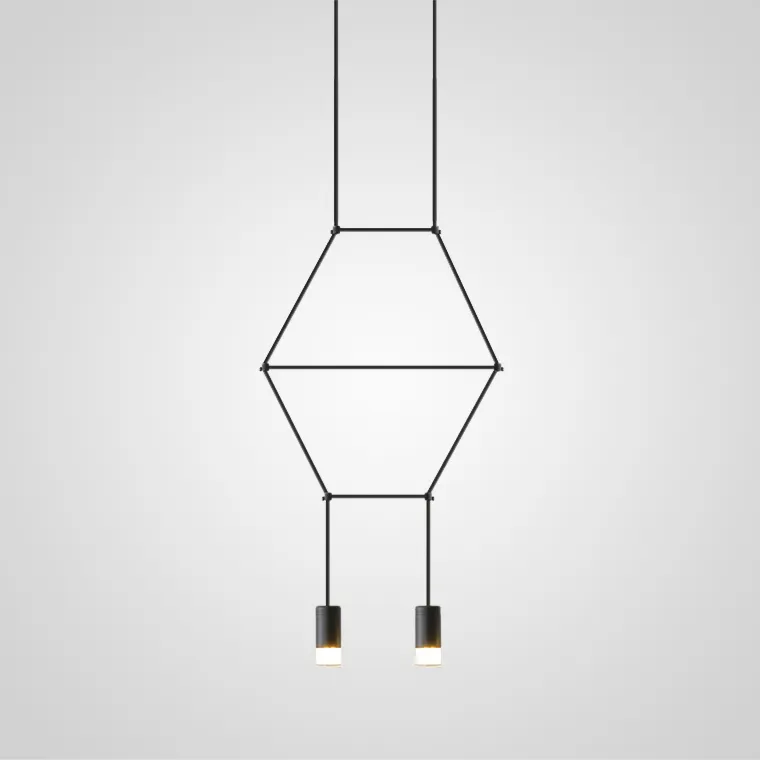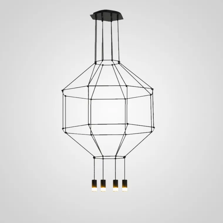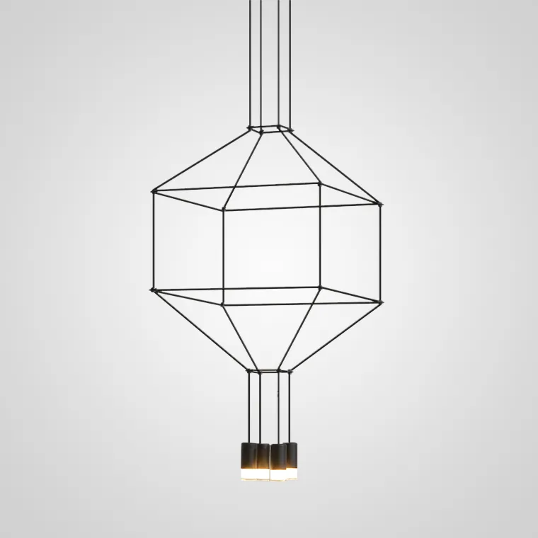Стиль постмодерн, в котором выполнена подвесная люстра VIBIA, — самое современное дизайнерское решение, подходящее для однотонного интерьера. Геометрические объемные фигуры выглядят элегантно и современно. Все каркасы этой серии выполнены в черном цвете, а количество ламп варьируется от 2 до 20, в зависимости от выбранной модели источника света. Предусмотрен реечный вариант из 10 ламп.