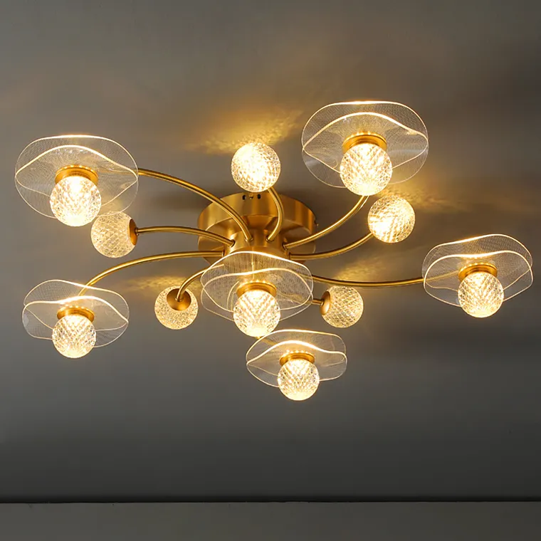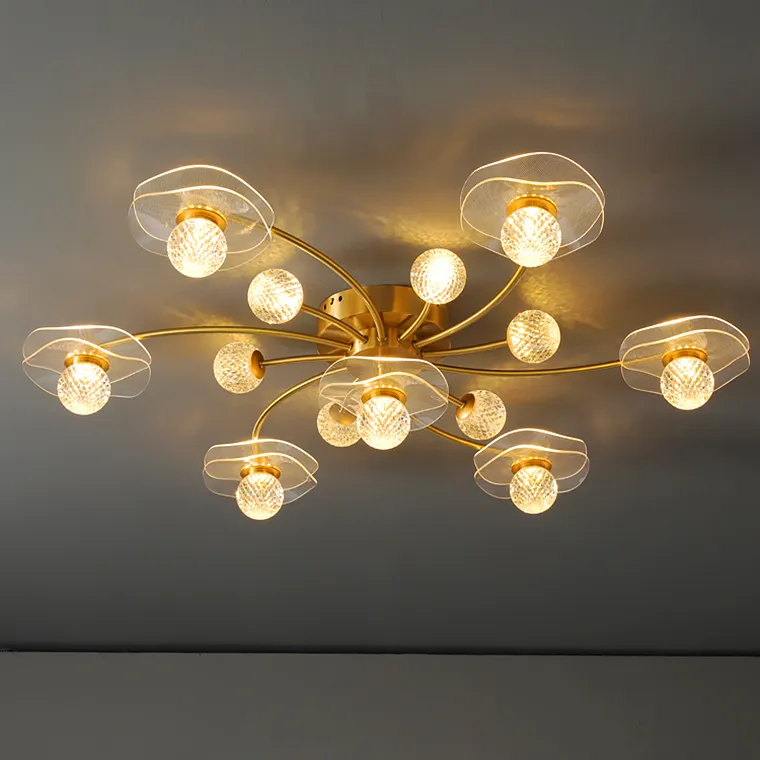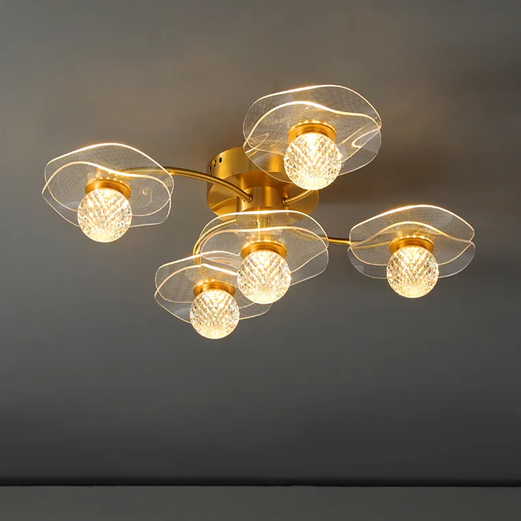 Потолочная люстра в виде цветка с акриловыми изогнутыми пластинами с точечным паттерном и шарообразными резными плафонами
