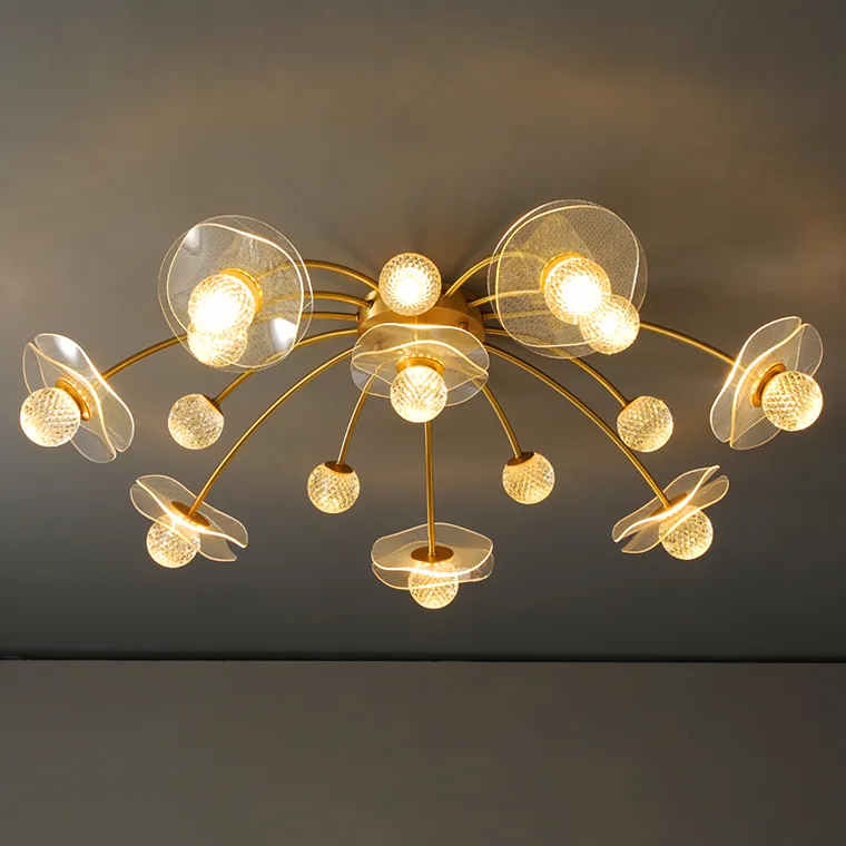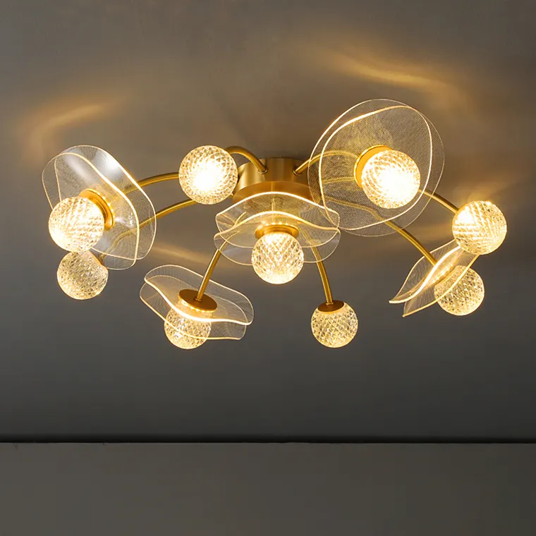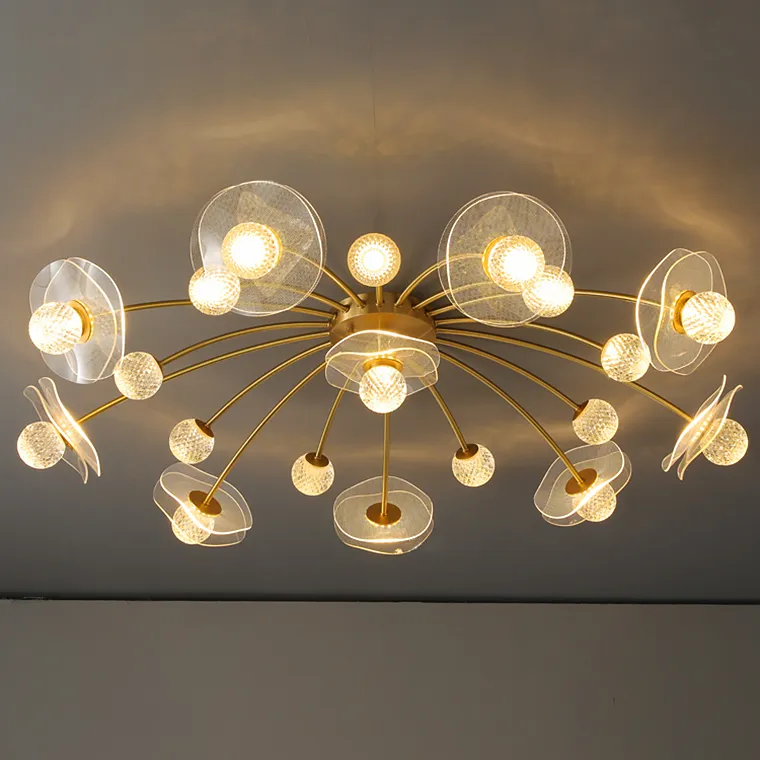 Потолочная люстра в виде цветка с акриловыми изогнутыми пластинами с точечным паттерном и шарообразными резными плафонами