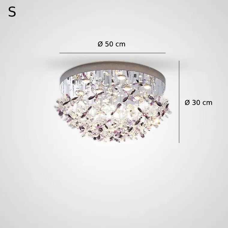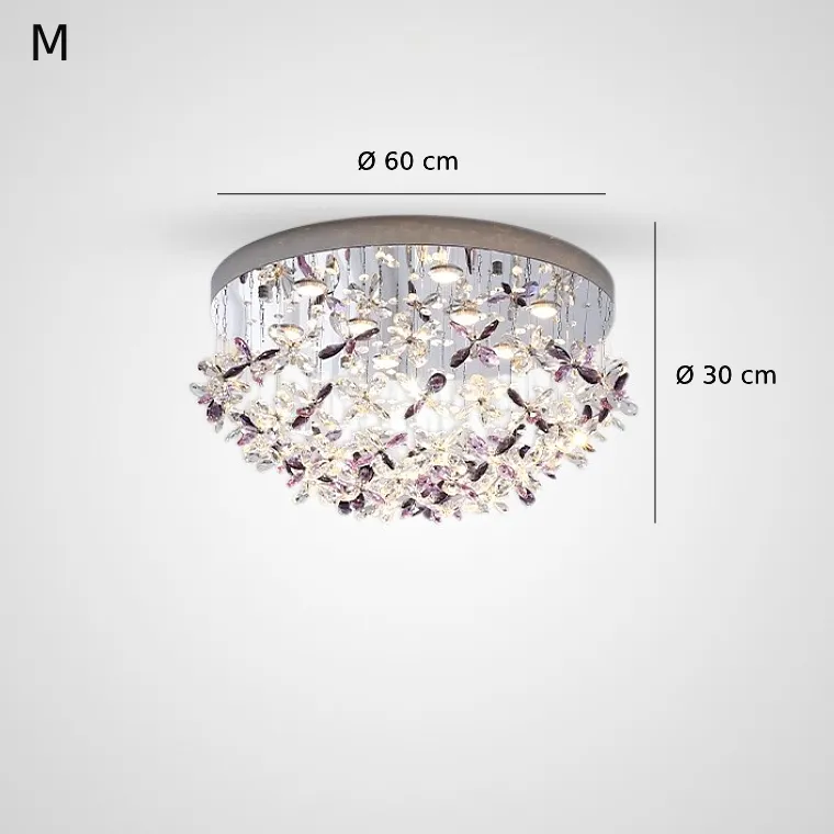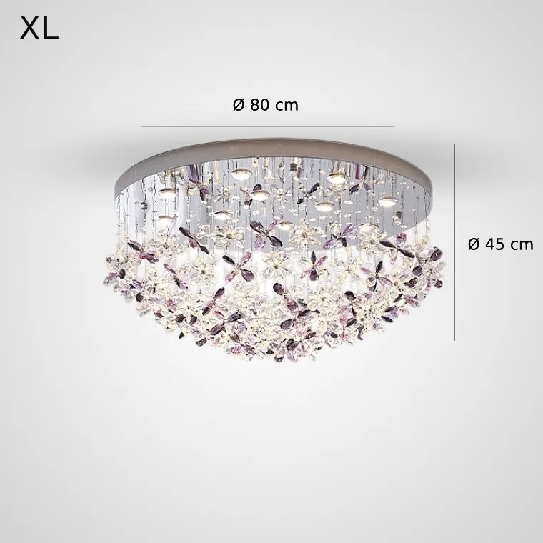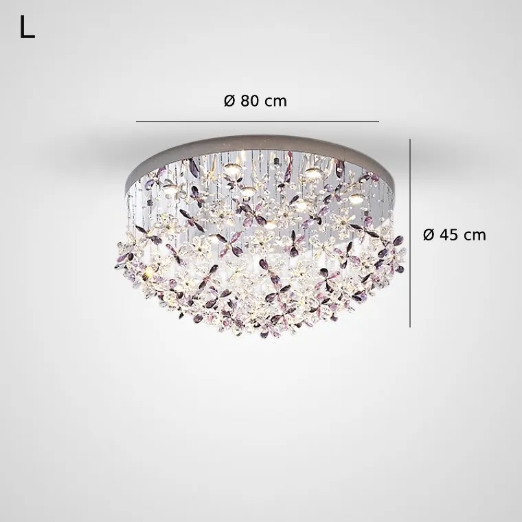 Потолочные люстры из подвесных хрустальных элементов в форме цветков на дисковом основании с точечными источниками света