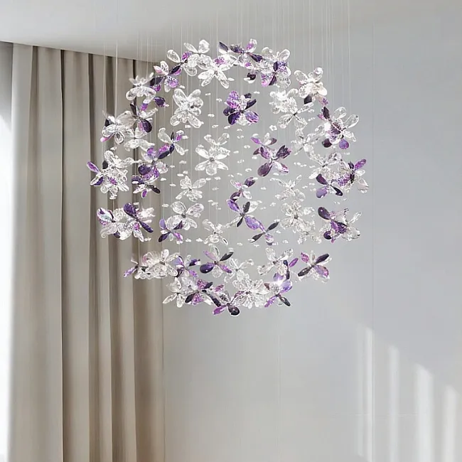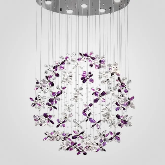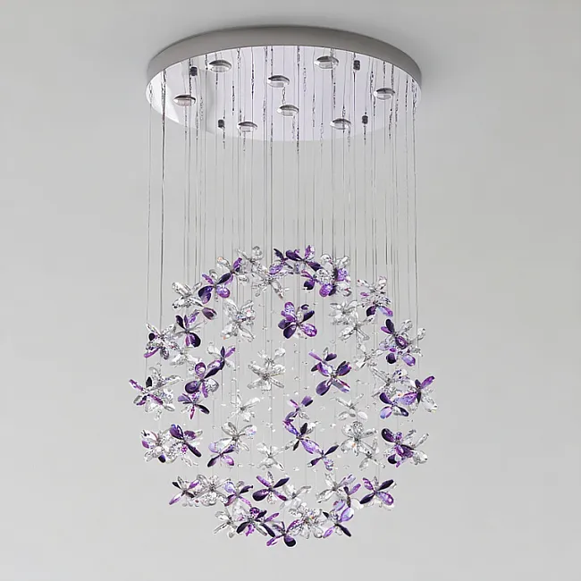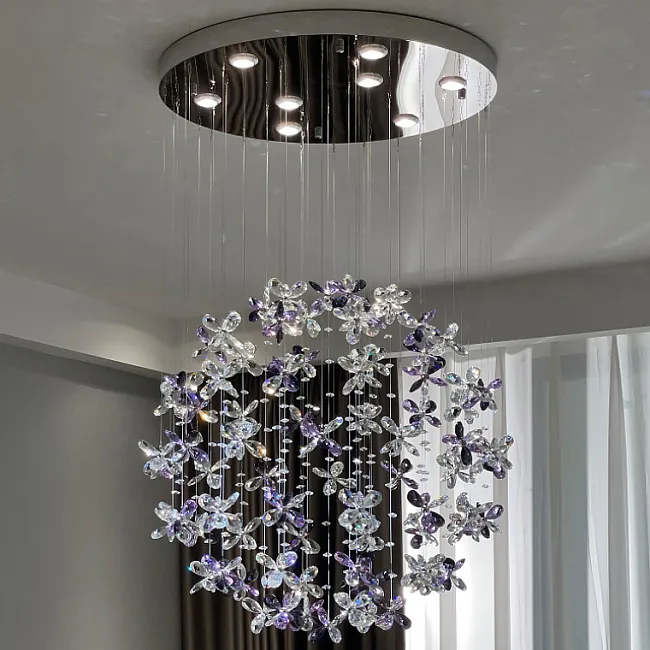 Потолочные люстры из подвесных хрустальных элементов в форме цветков на дисковом основании с точечными источниками света