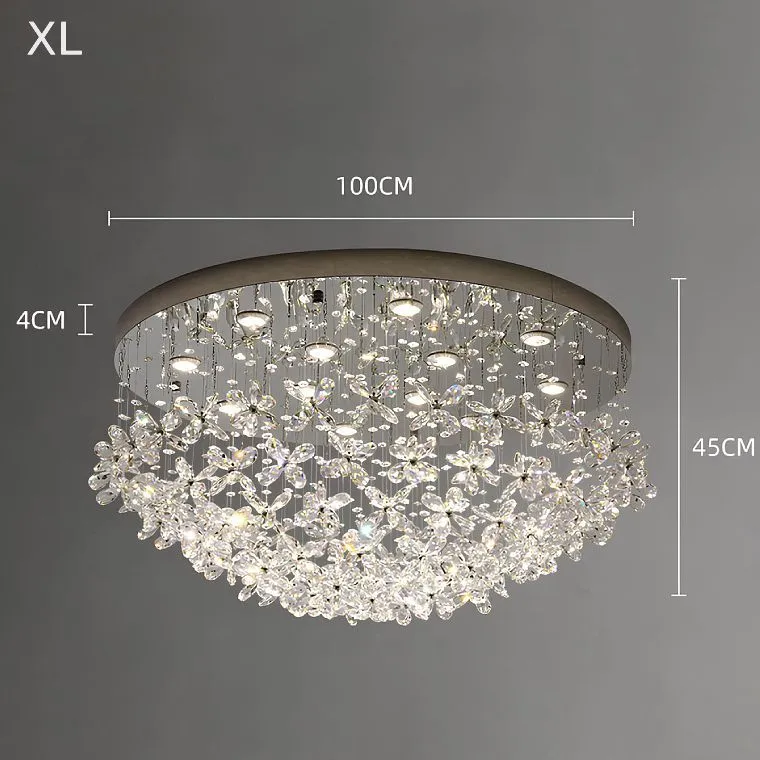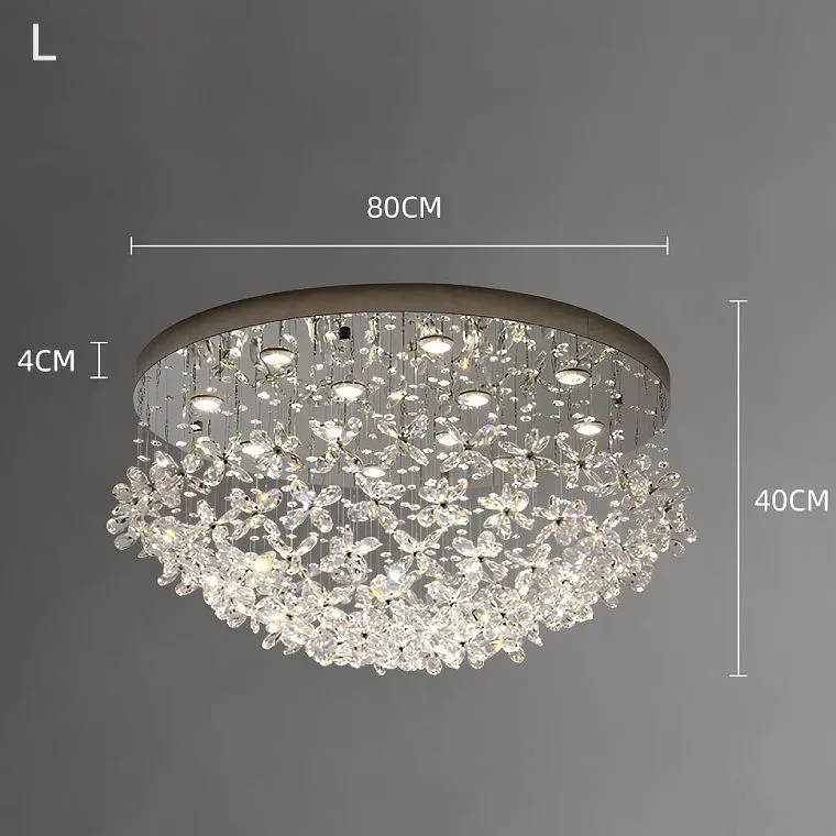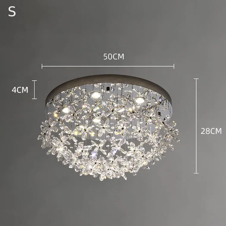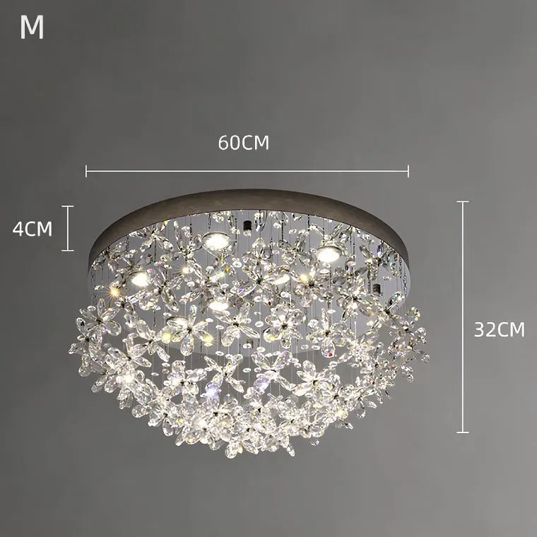 Потолочная люстра в виде инсталляции из подвесных хрустальных цветов, подсвеченных светодиодными источниками, расположенными на круглом креплении