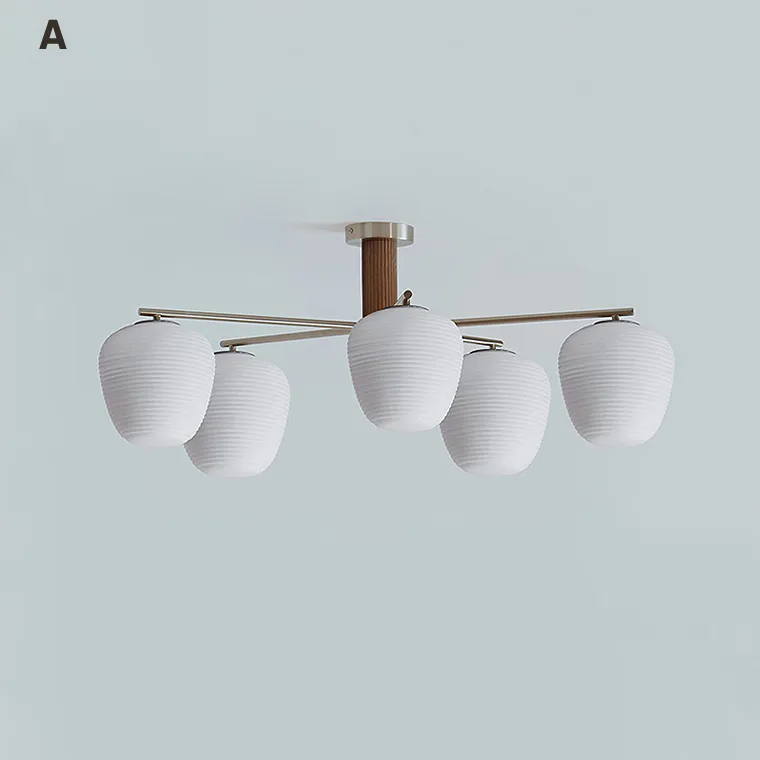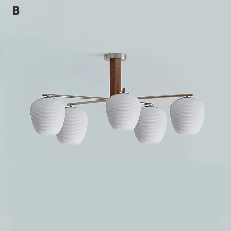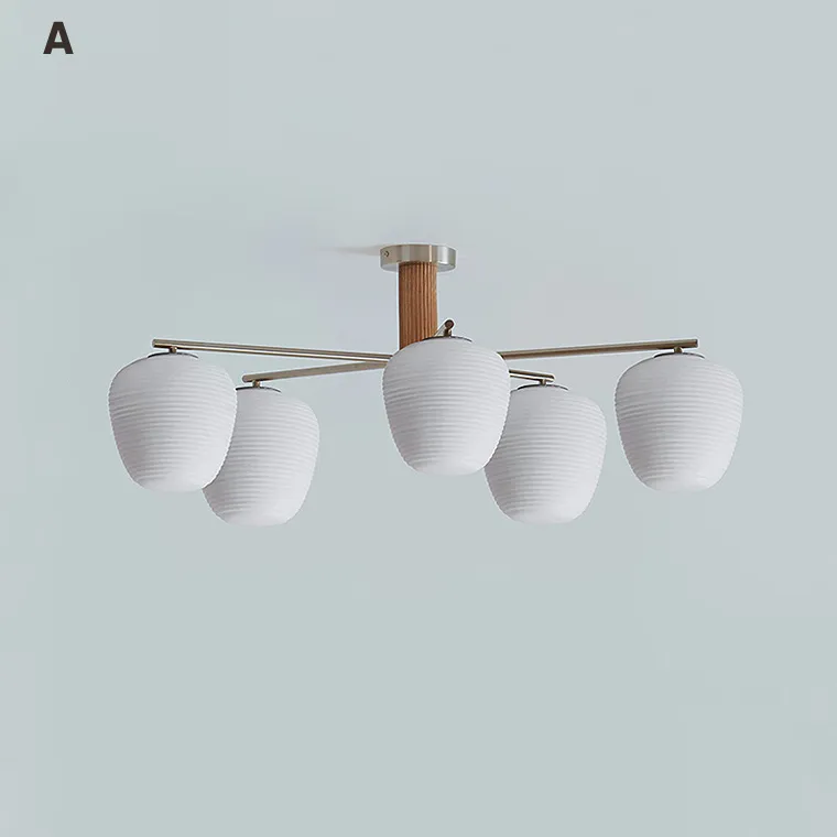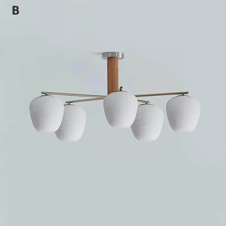 Серия потолочных люстр с рельефными плафонами из стекла на лучевом каркасе с деревянной стойкой
