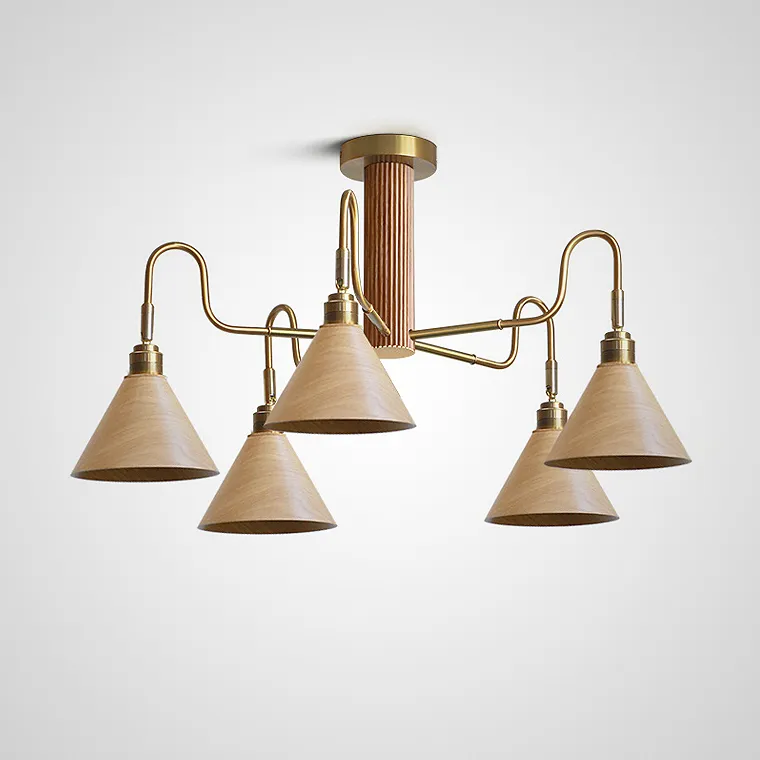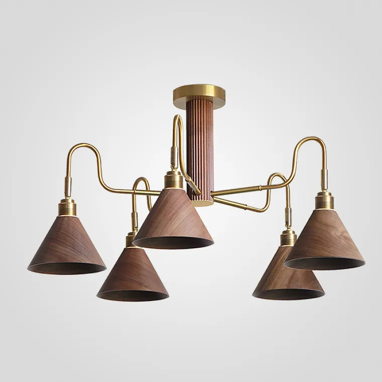 Серия люстр поворотными плафонами конусообразной формы из натурального дерева темного ореха и светлого дуба с латунной отделкой