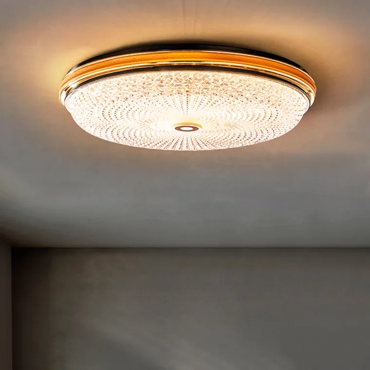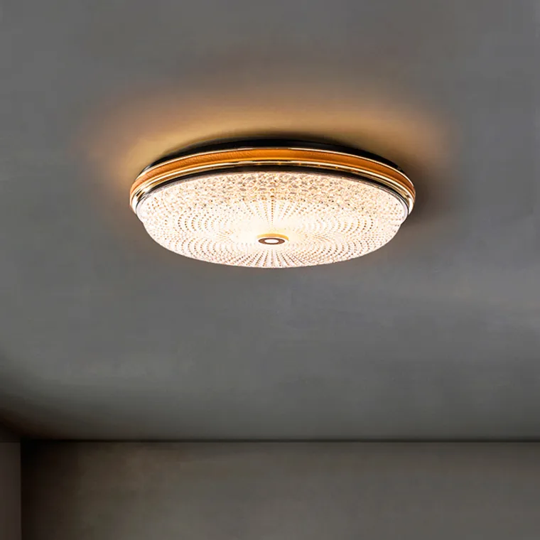 Круглая люстра для низких потолков со вставками из натуральной кожи и текстурным рельефным абажуром