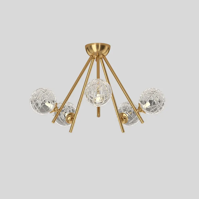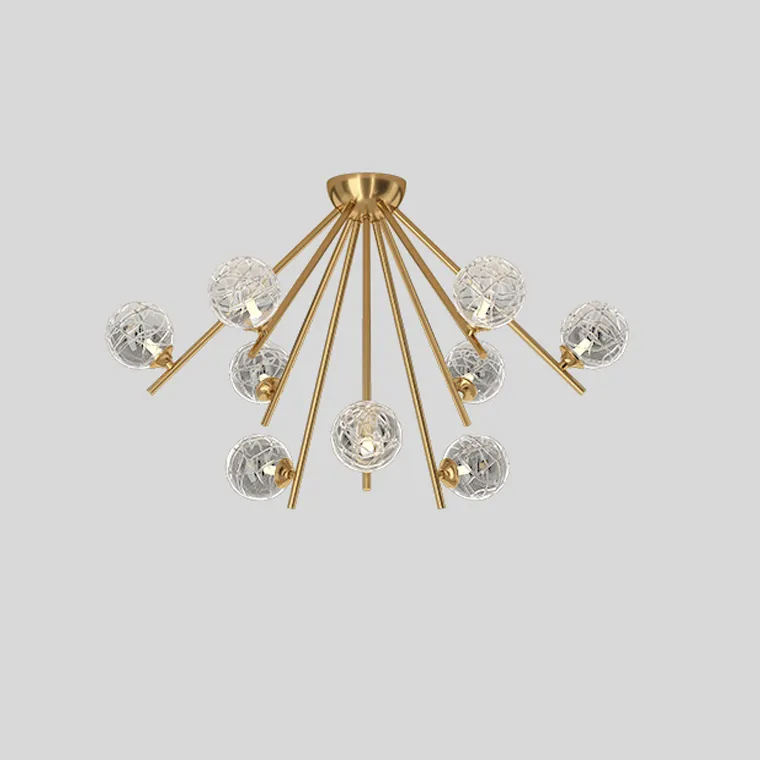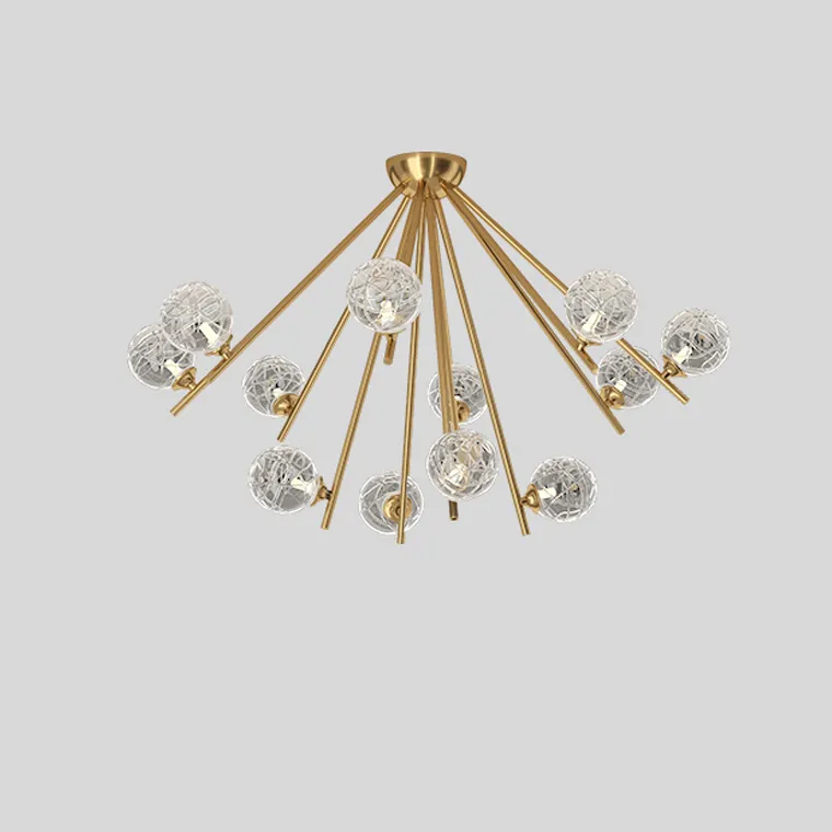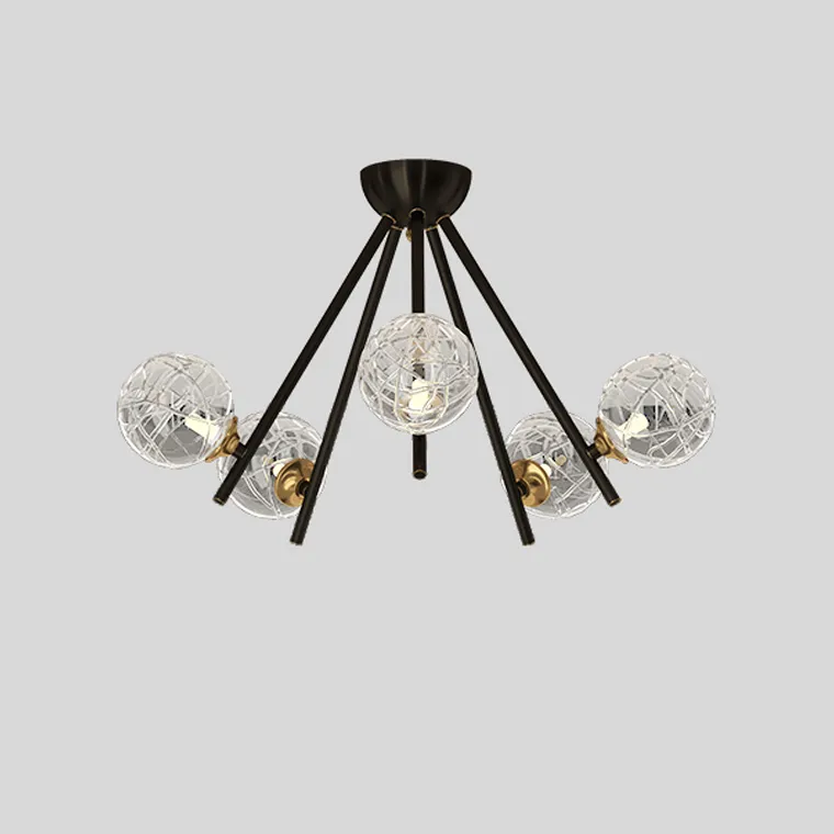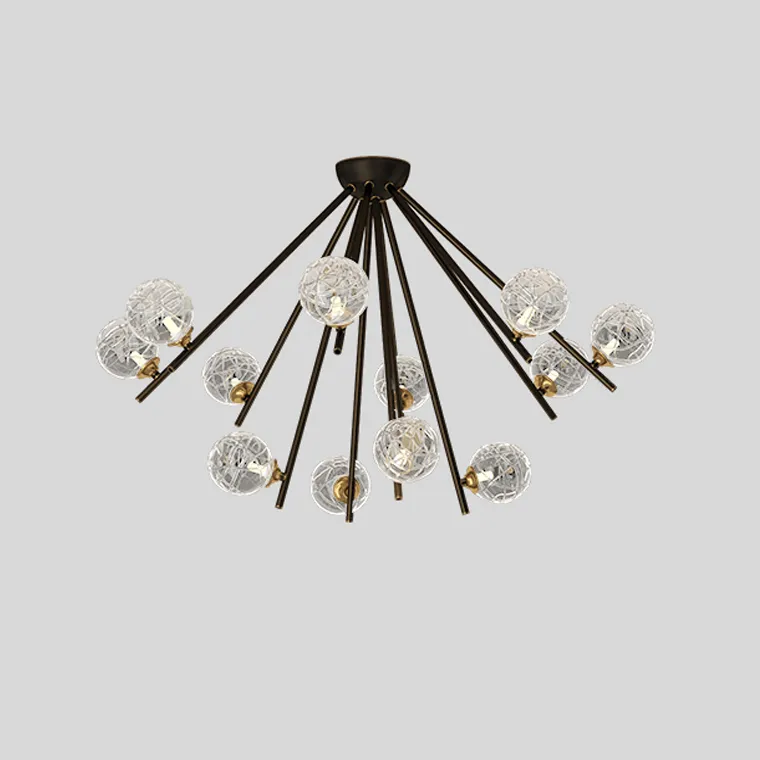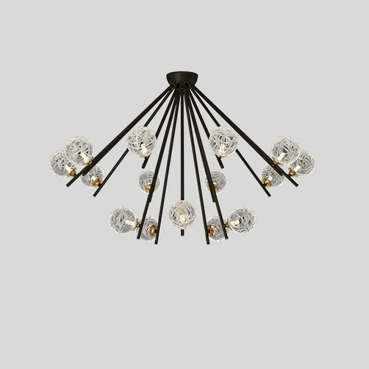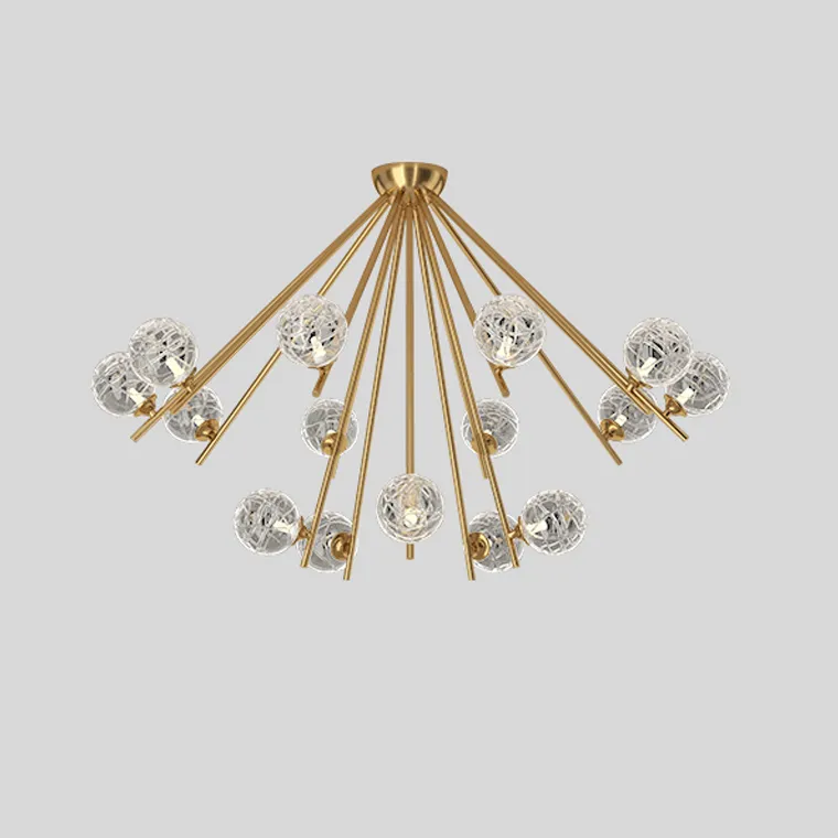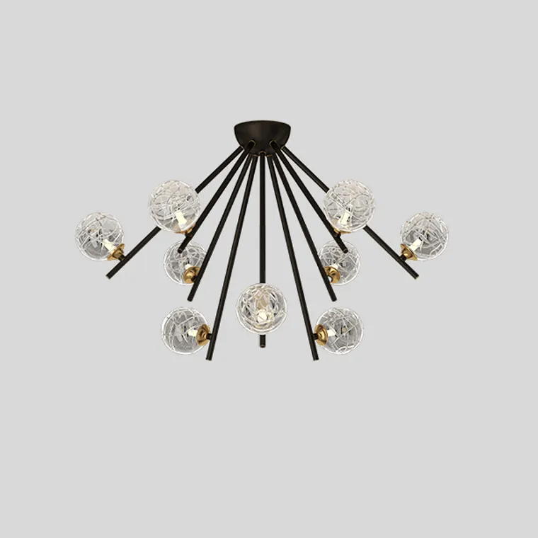 Серия потолочных люстр с шарообразными плафонами из кракелированного стекла на лучевом каркасе