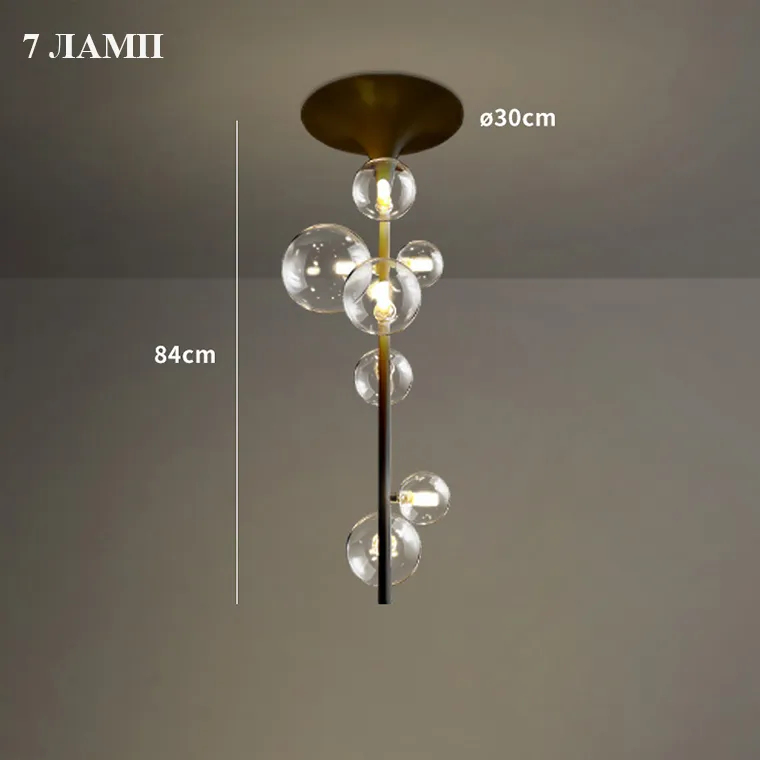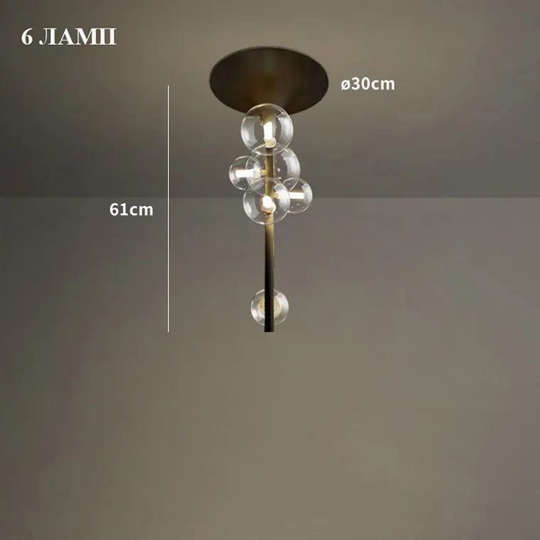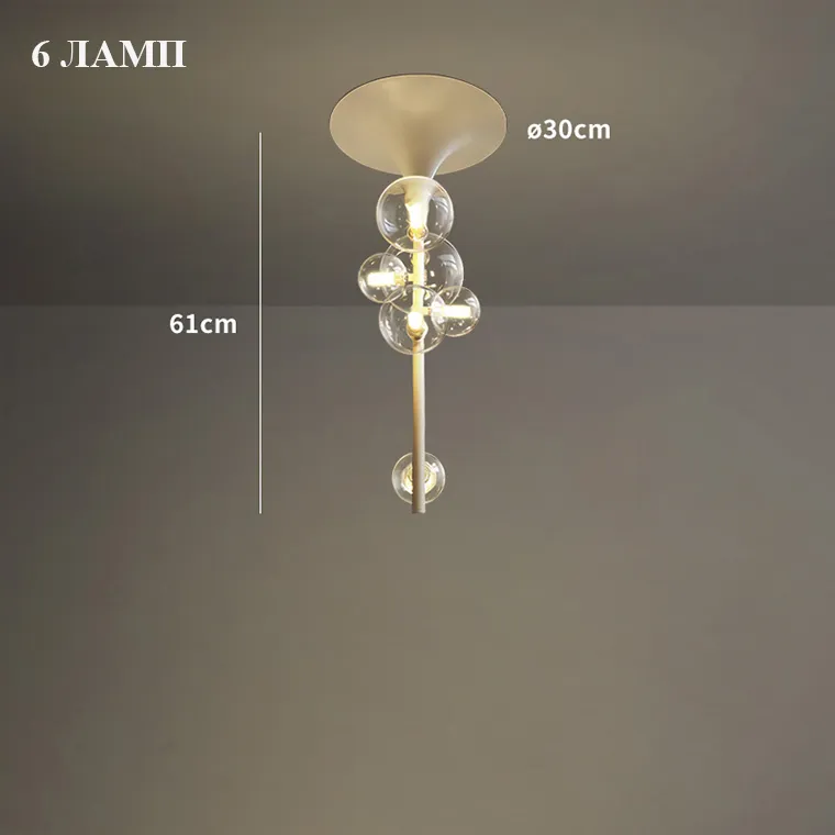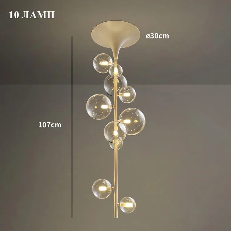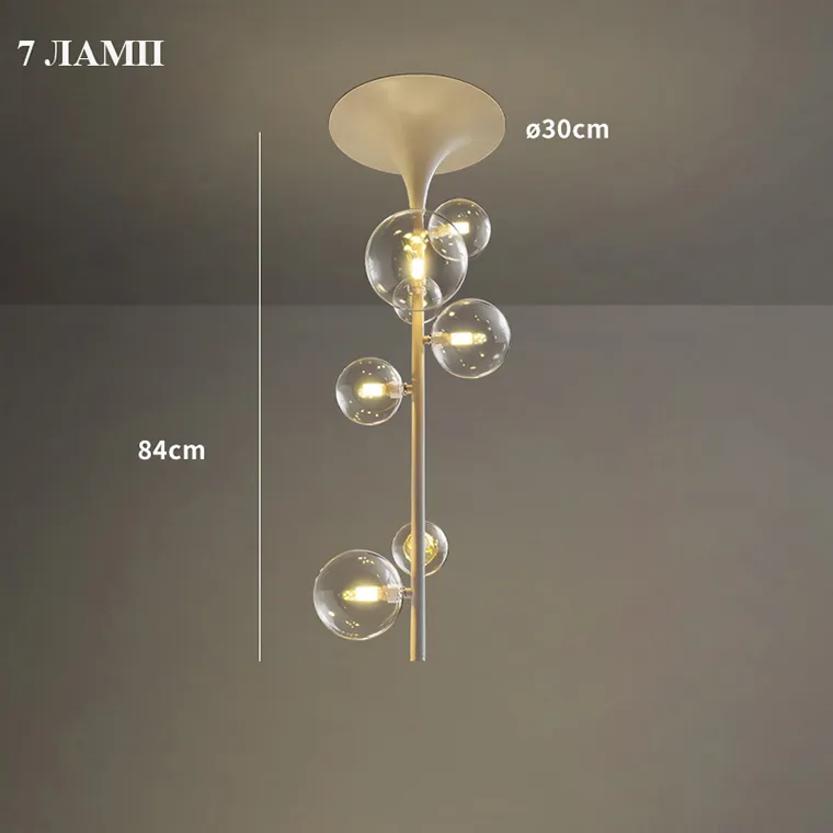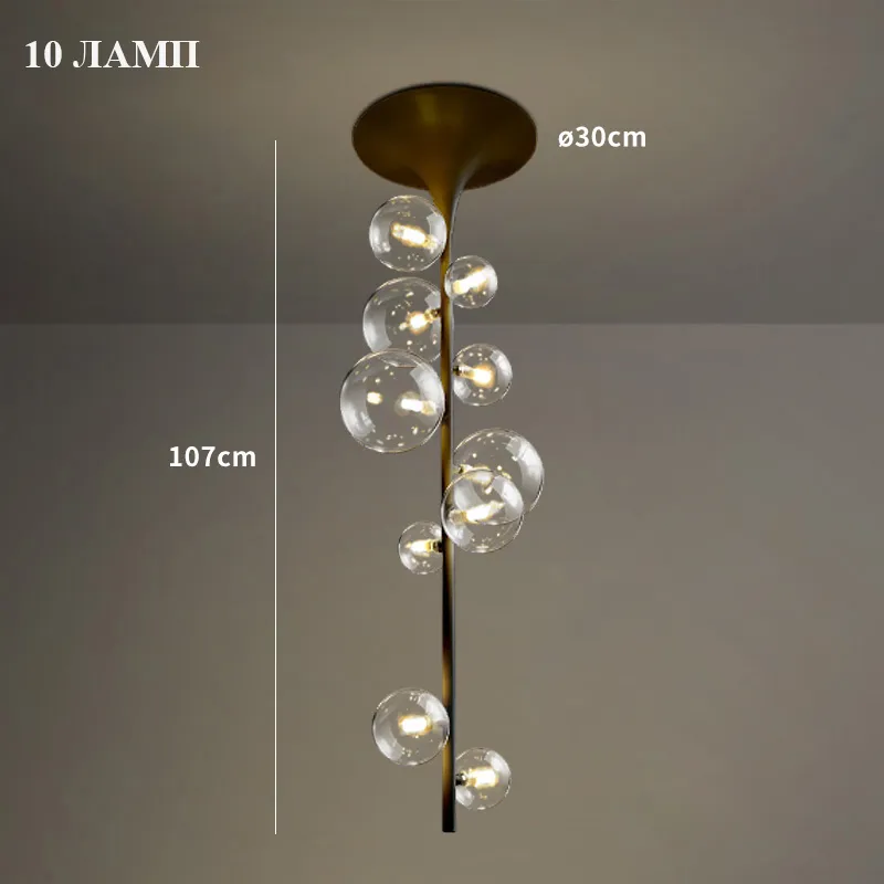 Серия потолочных светильников IONA LINE с прозрачными шарообразными плафонами разного размера на вертикальной стойке