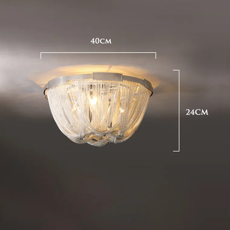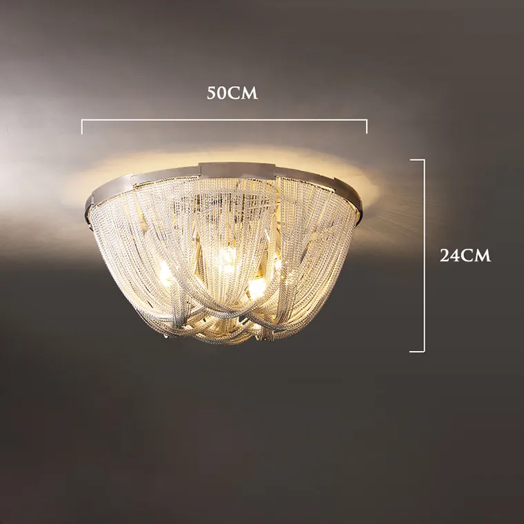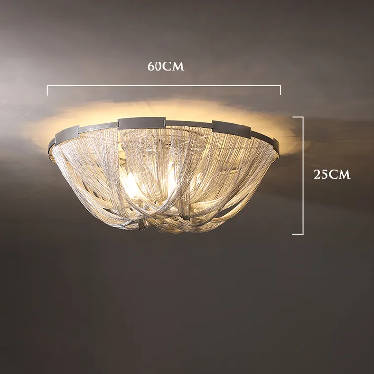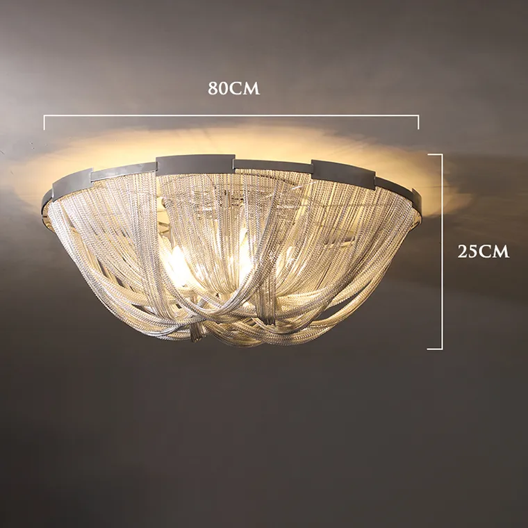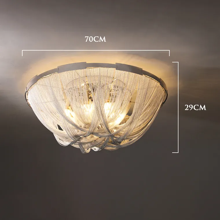 Потолочная люстра с переплетенным абажуром из множества хромированных цепочек