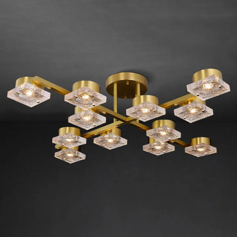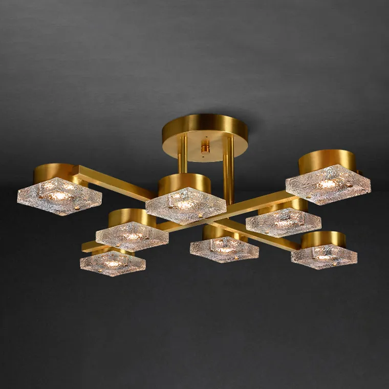 Люстра для низких потолков в минималистичном стиле с круглыми крепежными элементами и квадратными рассеивателями с имитацией водной ряби на стекле