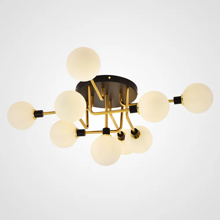 Если клиент не любит стандартные источники освещения, которые видели дома у друзей и знакомых, вероятно, ему понравится потолочная люстра NEXO с черно-золотым или черно-серебряным каркасом. Плафоны выполнены в четырех разных оттенках, среди которых «молочный», «янтарь», «дымчатый», «прозрачный». Количество ламп — 5 или 9. Выбирайте в зависимости от требуемой площади освещения.