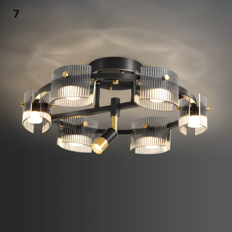 Люстра оказалась просто замечательная и функциональная. Она потолочная, поэтому места немного занимает и даже для невысоких потолков подходит. Тут восемь ламп на кольцевом каркасе (они спрятаны за стеклёнными ребристыми пластинками) и два спота по центру, причём их можно направлять в нужные стороны. Вся комната отлично освещена. Мне очень нравится, как эта люстра светит. И её можно переключать, чтобы выбирать подходящий свет освещения.