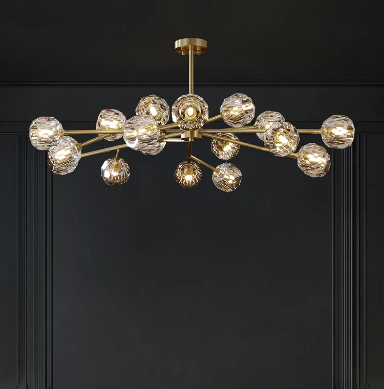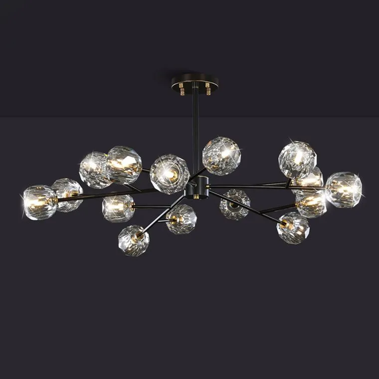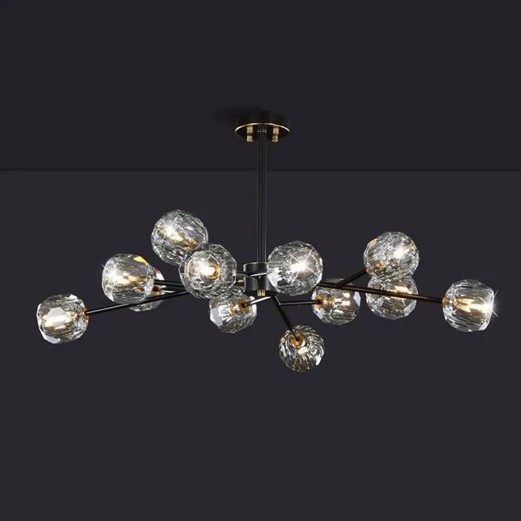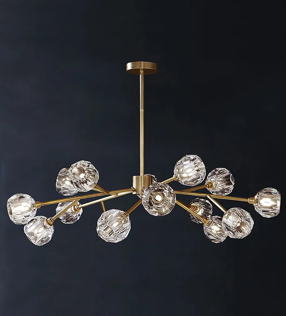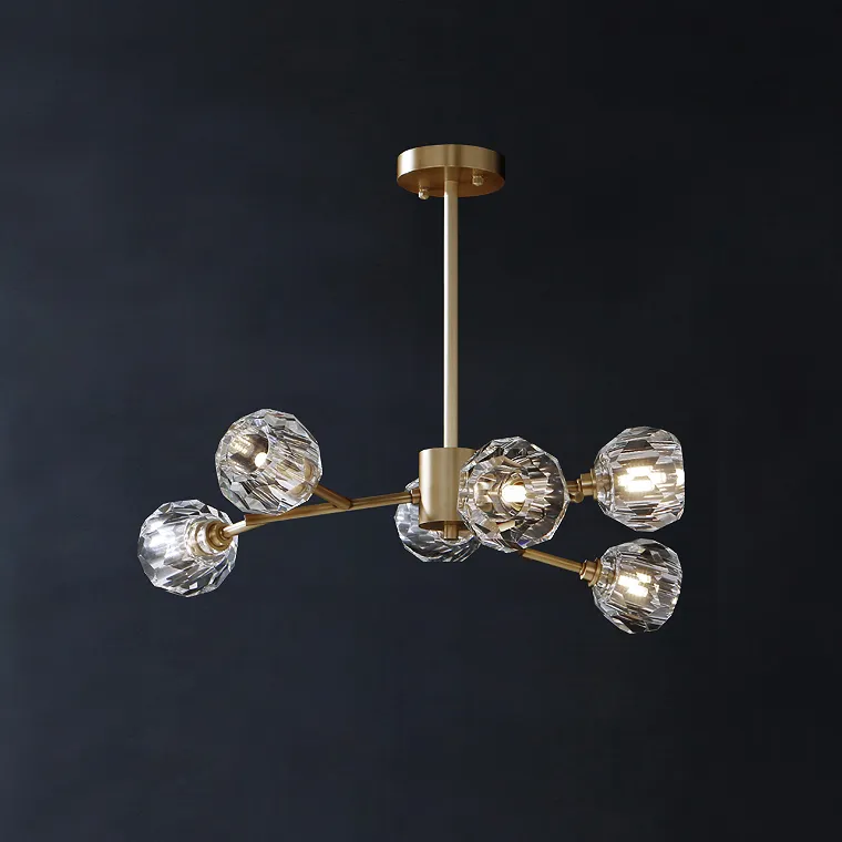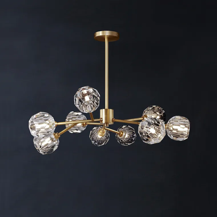 Разглядывая плафоны этой люстры, память уносит нас на несколько десятилетий назад, когда постмодерн был на пике популярности. Его отличительными чертами стали: использование готовых форм, маргинальность, ирония, синтетичность и сплав старого в новом контексте. Люстра с плафонами из граненого стекла и каркасом из металла латунного цвета RH SHORT – яркий представитель этого необъятного стиля.