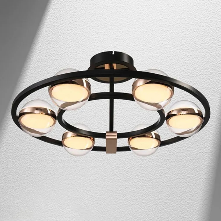 Эти люстры имеют уникальную конструкцию, состоящую из изящных колец, объединенных в единую композицию. Вращающиеся плафоны в форме шара, украшенные декоративным металлическим ободом, придают люстре особый шарм и неповторимость.