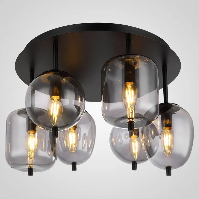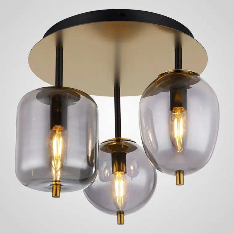 Потолочная люстра со стеклянными плафонами различной геометрической формы на дисковидном основании