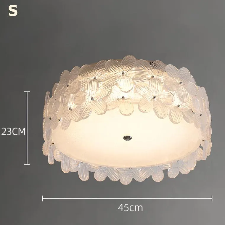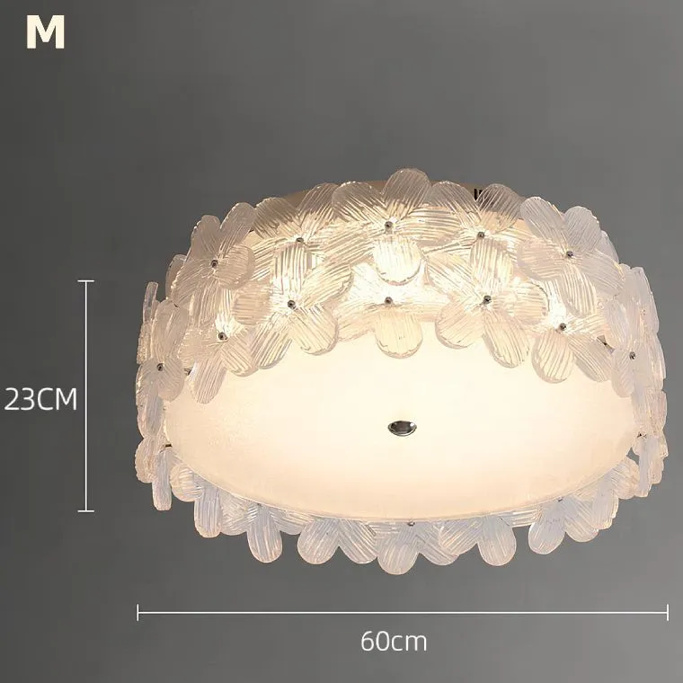 Круглая форма люстры окантована цветочным декором в два слоя, что придает воздушность и элегантность. Особое внимание заслуживают мастерски проработанные стеклянные цветы с детализированными прожилками. Это придает им особую неповторимость и выразительность, делая люстру по-настоящему уникальной.