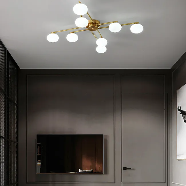 Основой этой люстры является полуматовое рельефное стекло, что создает мягкое и равномерное освещение. Люстра TOTTI SHORT идеальный выбор для помещений с низкими потолками.