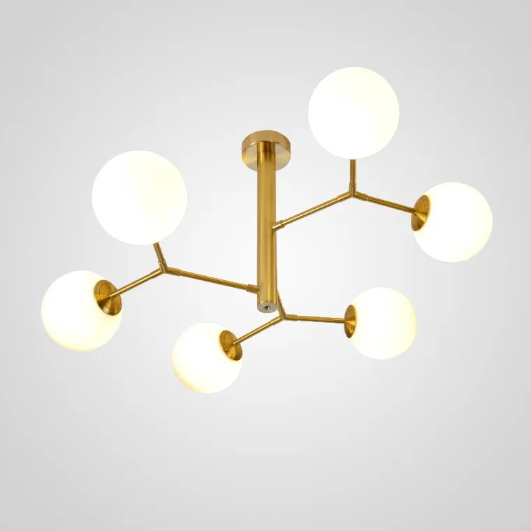 Форма плафонов выполнена в виде шара, а цвет каркаса и плафонов – золото и белый матовый соответственно. Каркас изготовлен из прочного металла, что обеспечивает надежность и долговечность люстры. Плафоны выполнены из качественного стекла, которое обеспечивает мягкое и равномерное освещение.