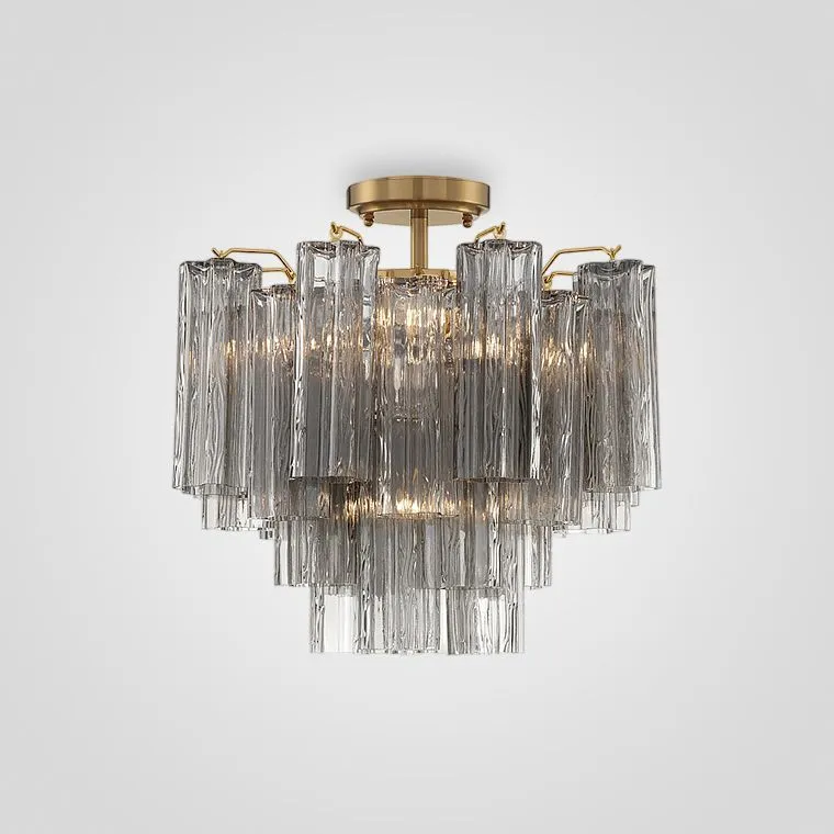Серия потолочных люстр с трубчатыми фигурными элементами из цветного стекла, расположенными в несколько ярусов