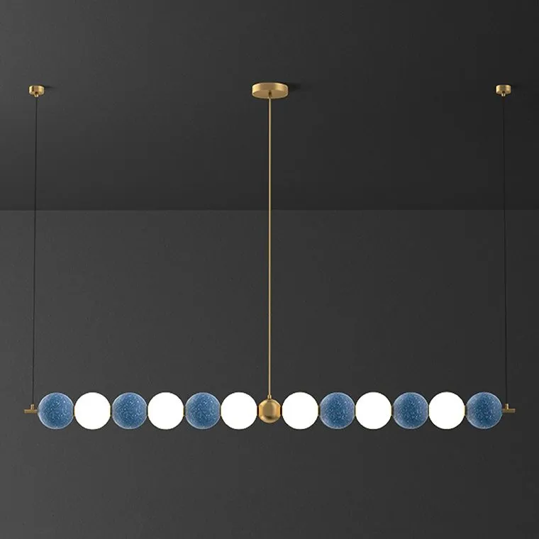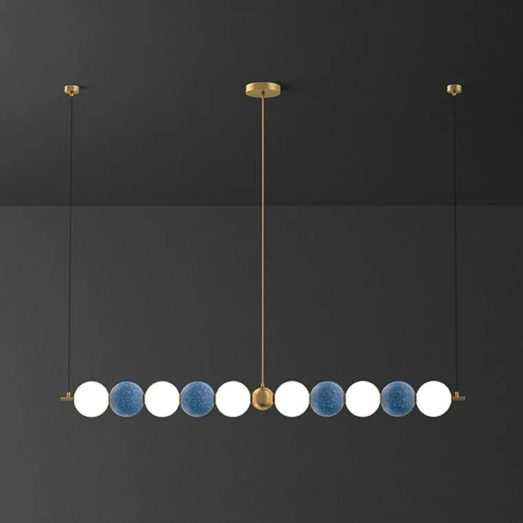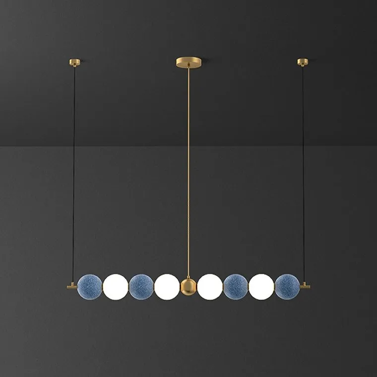 Отличительной особенностью этих реечных люстр является комбинация шарообразных плафонов из молочного стекла, создающих мягкий и рассеянный свет, и декоративных полипропиленовых шаров трех цветов: серого, синего и черного. Такое сочетание делает эти светильники не только функциональными, но и стильными элементами интерьера.